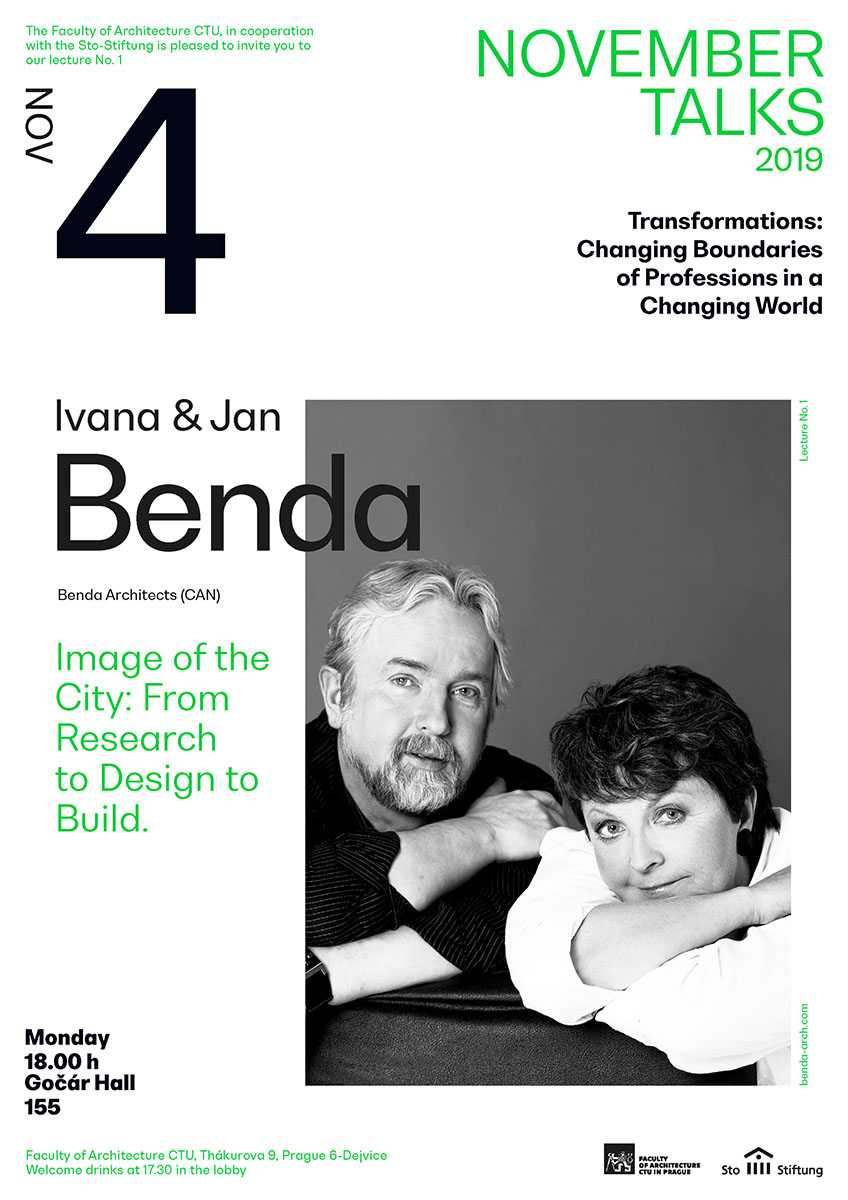 Přednáškový cyklus November Talks na Fakultě architektury ČVUT zahájí v pondělí 4. listopadu Ivana a Jan Bendovi, česko-kanadští architekti a urbanisté s rozsáhlou globální profesní zkušeností. V přednášce s názvem Image of the City: From Research to Design to Build představí výzkum prostorové struktury města Mostu, který zpracovávali v 70. letech a ze kterého následujících 40 let čerpali ve své mezinárodní architektonické a urbanistické tvorbě.