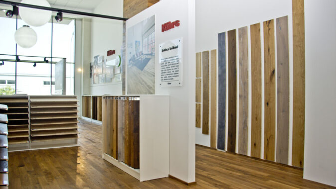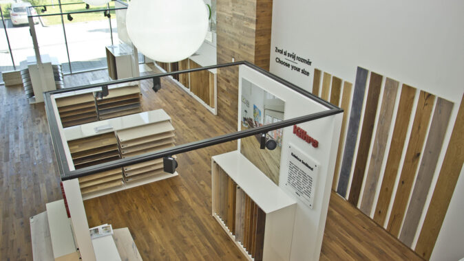 V přízemí jsou u dřevěných podlah na stěnách vystaveny reálné ukázky formátů, od několika centimetrových lamel až po 6metrové prkno, od jednolamel po třílamely, včetně ukázek zámkových spojů a perodrážek pro lepší představu, jak se pokládá plovoucí podlaha, respektive jak se krytina celoplošně lepí.