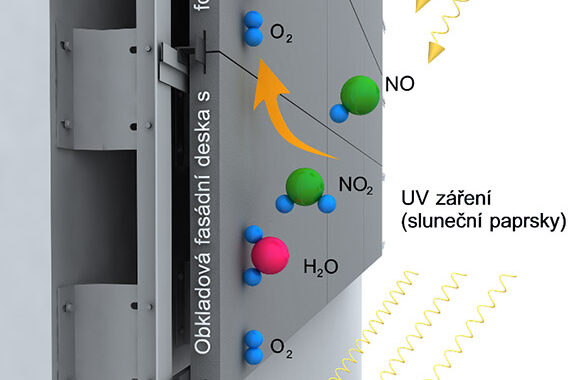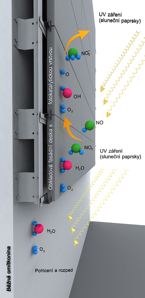 Funkce fotoaktivních fasádních desek spočívá v aplikaci speciální fotokatalytické příměsi na bázi TiO2