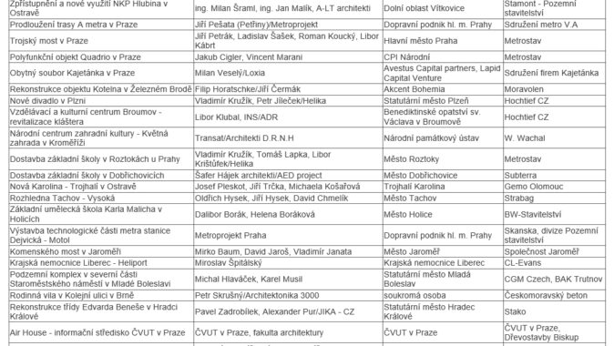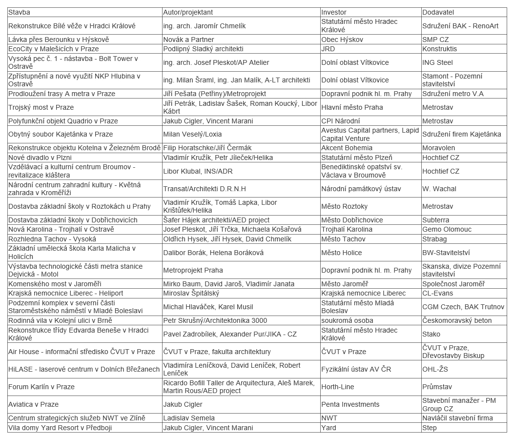Loňskými stavbami roku byly Středoevropský technologický institut CEITEC v Brně, lanová dráha na Sněžku, rodinný dům „LF“ v pražských Nebušicích, letecké muzeum Metoděje Vlacha v Mladé Boleslavi a obchodní centrum Šantovka v Olomouci. Veřejnost loni udělila cenu ostravskému Světu techniky ve Vítkovicích.