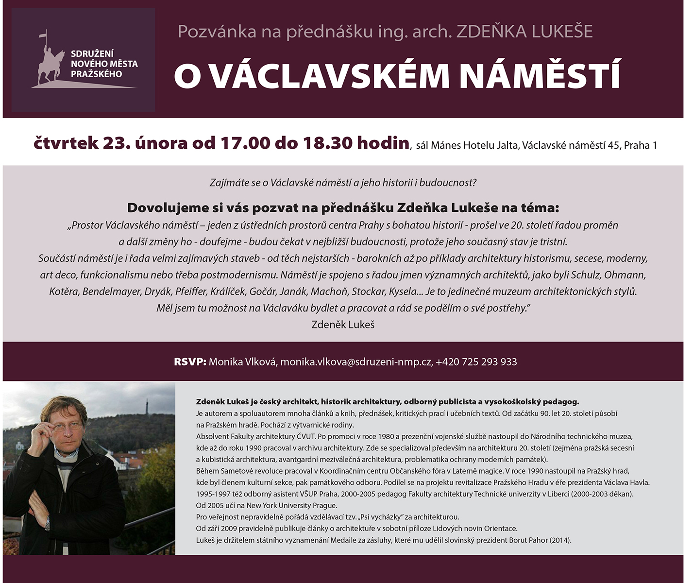 Ttento čtvrtek 23. února od 17 hodin se v sálu Mánes hotelu Jalta (Václavské náměstí 45) koná přednáška „O Václavském náměstí“ ing. arch. Zdeňka Lukeše věnovaná architektuře na nejznámějším pražském náměstí (a jeho dalšímu rozvoji).
