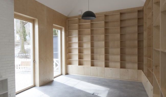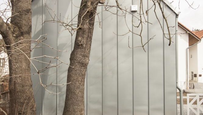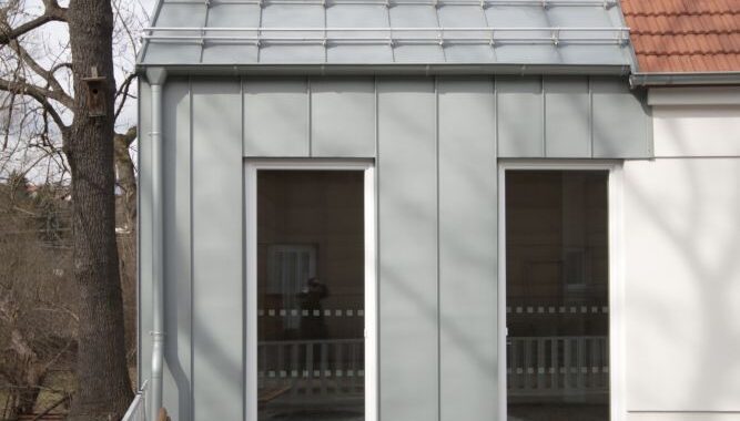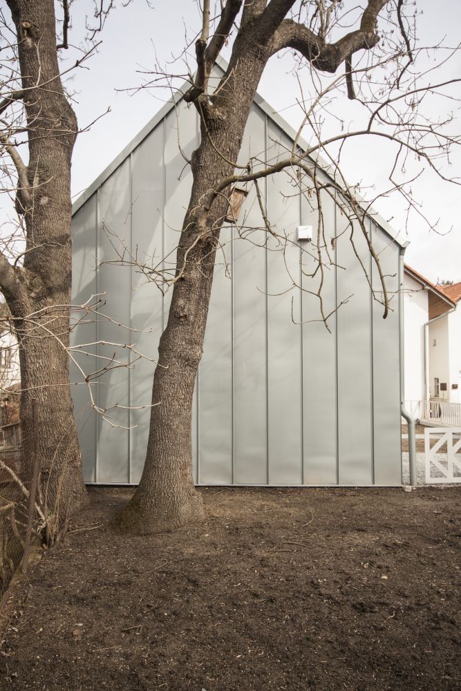 Lehká dřevostavba přístavby se stáčí společně s hranicí pozemku, opláštěná je falcovanou plechovou krytinou z předzvětralého titanzinku. Plech zrcadlí oblohu a stíny vzrostlých jasanů. Stávající část byla renovována v původním duchu.