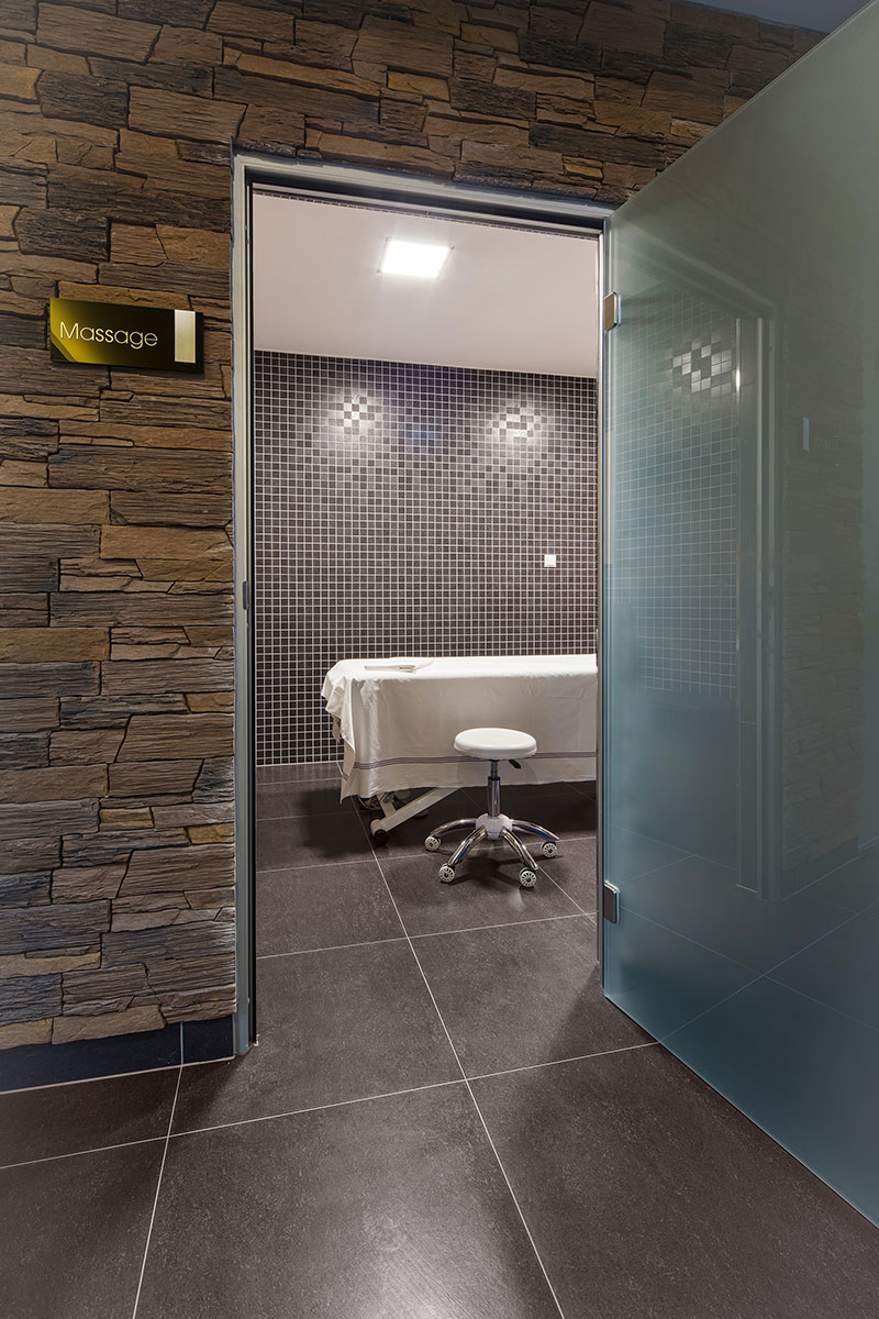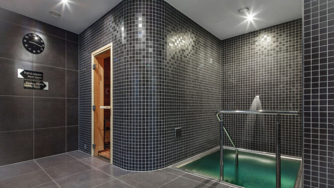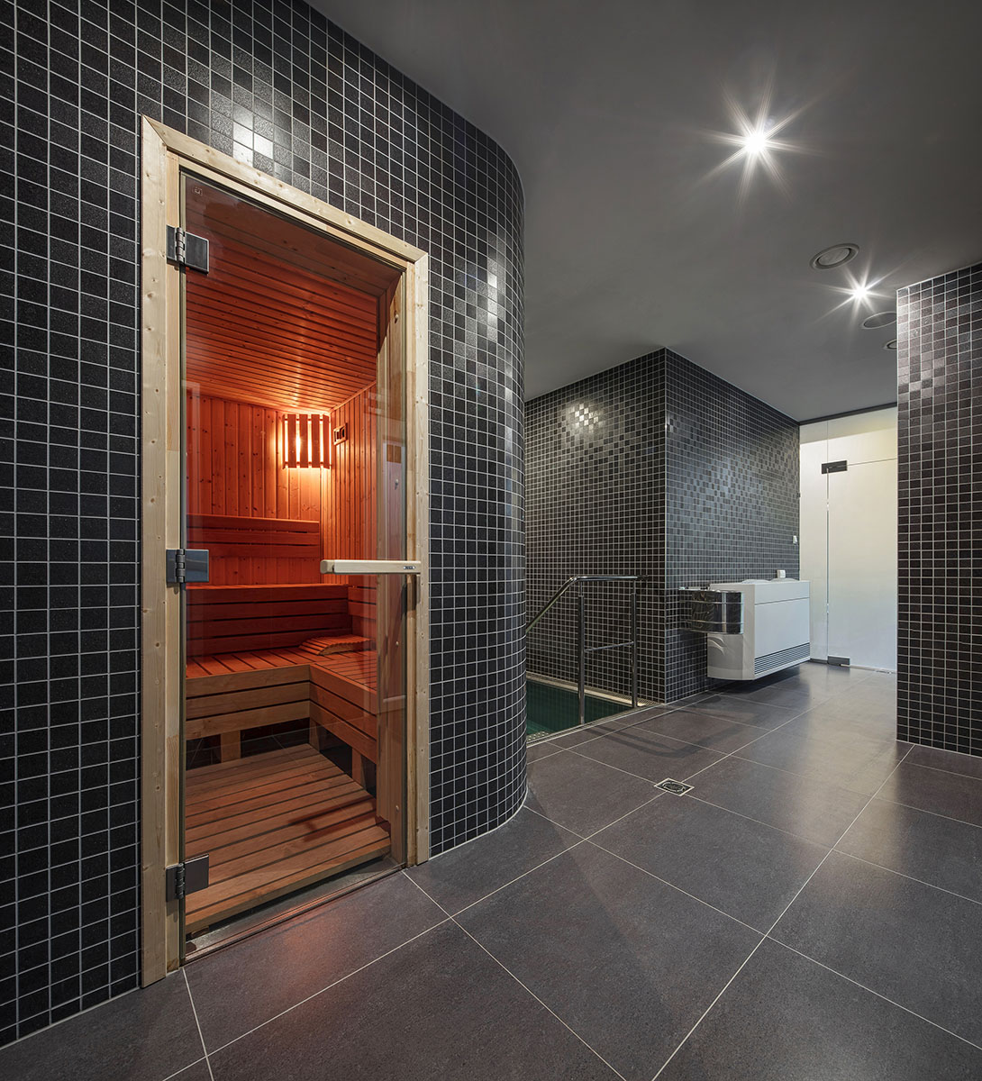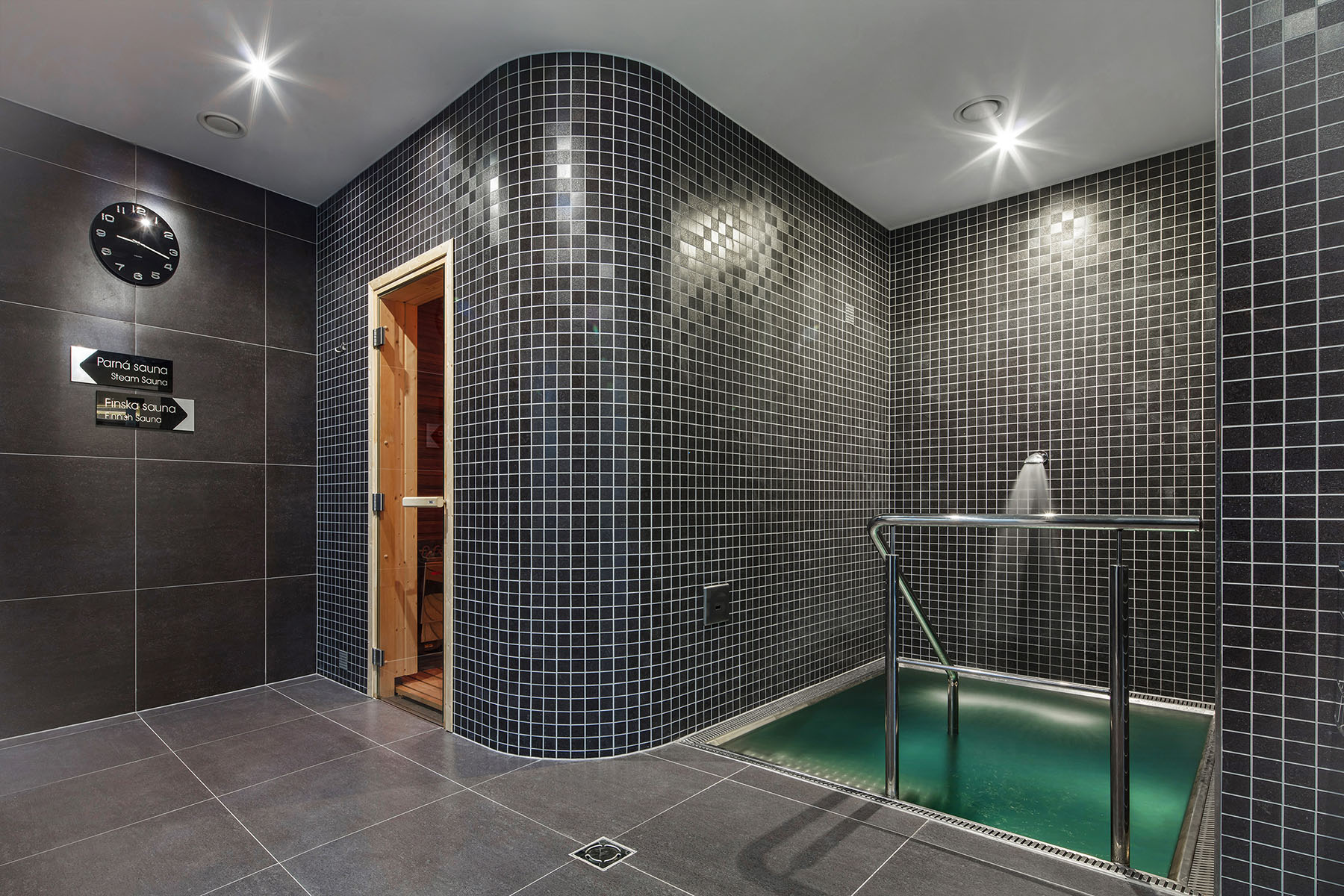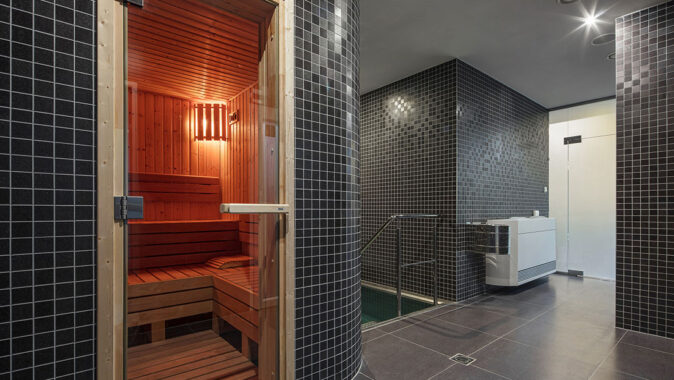 parní saunu, ochlazovací bazének, zážitkové sprchy, tepidarium a fitness.