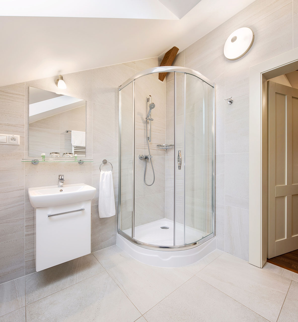 20 cm, ve světle béžovém odstínu. Výjimkou je bezbariérová koupelna, která