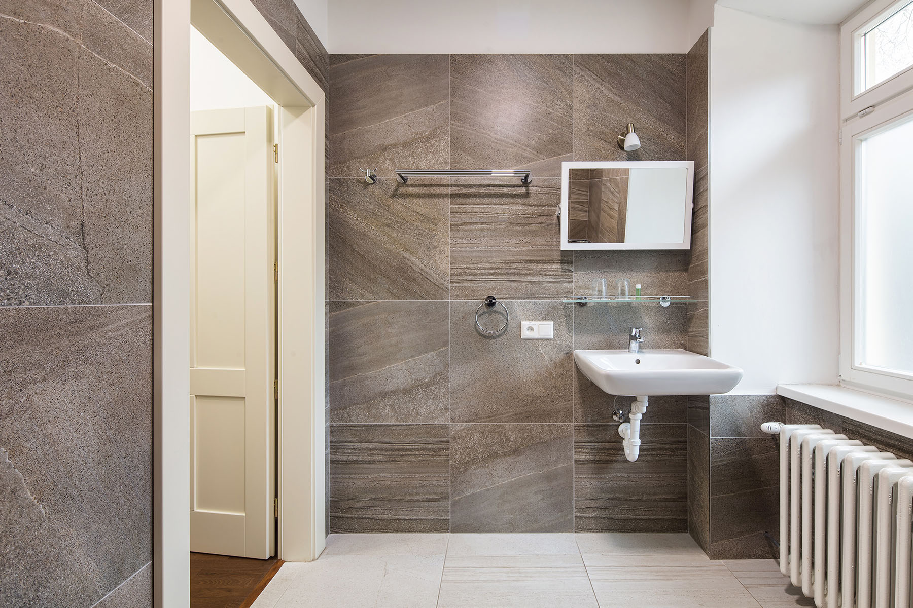 jejich vybavení. Nové keramické obklady s designem světlého kamene harmonizují