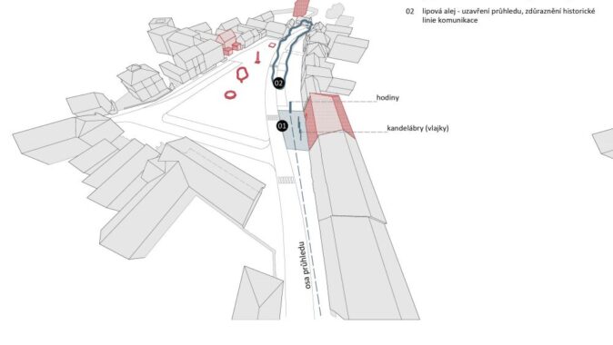 směrem od kašny k památníku zakončená polyfunkčním pódiem. Oba výjezdy na