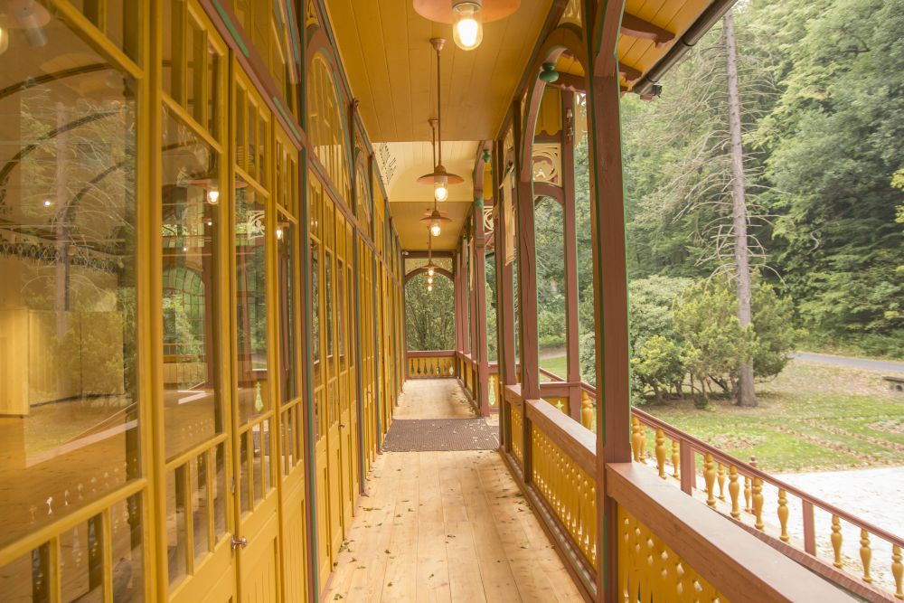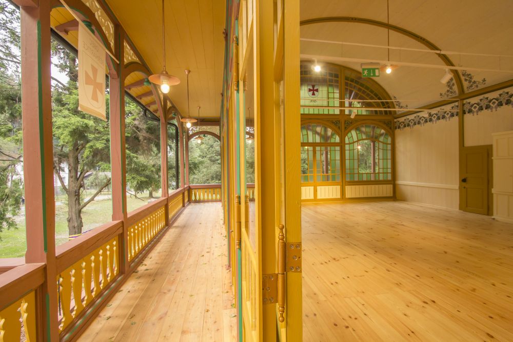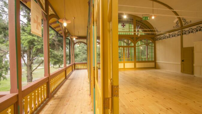 obloukově zaklenutý sál, obepnutý po obvodě dřevěnou pavlačí na konzolách. Ve