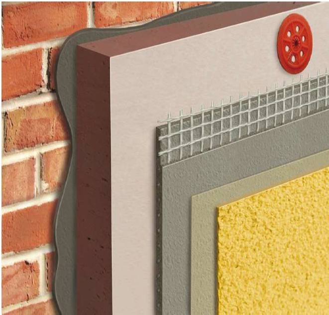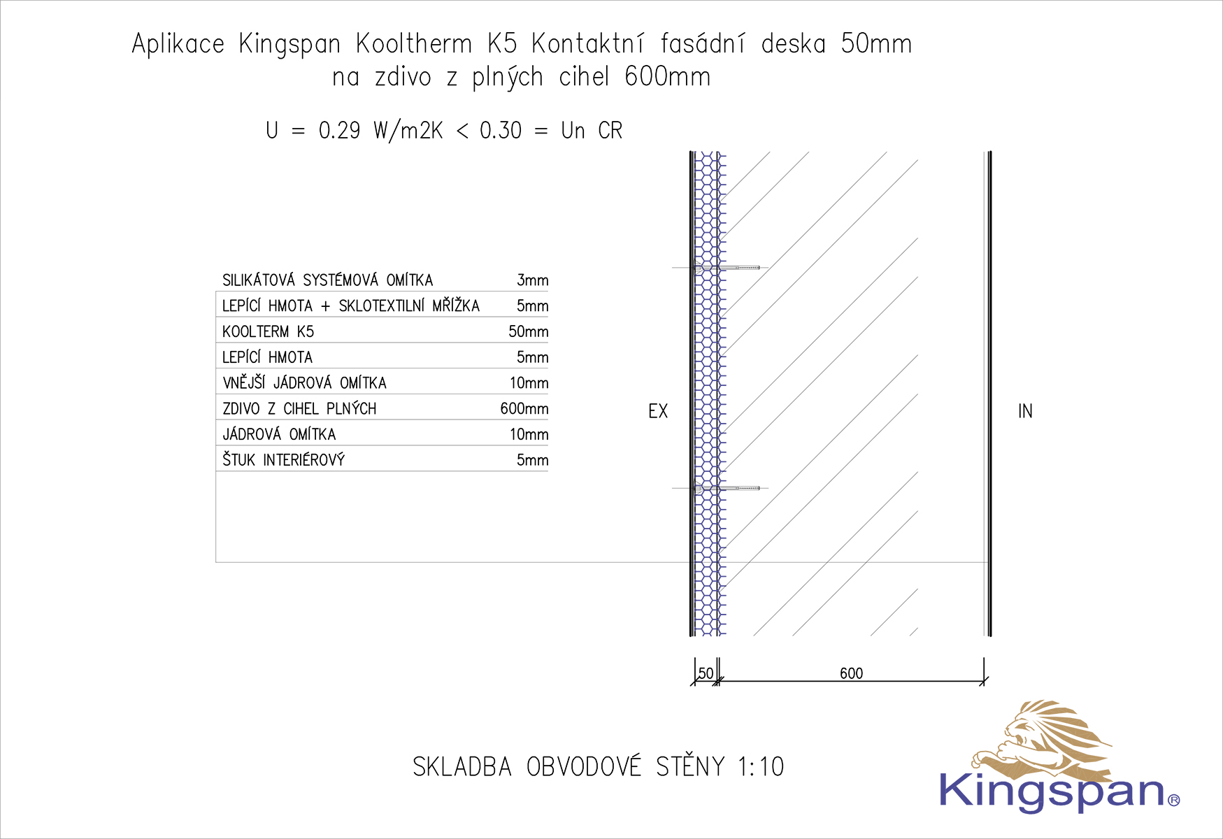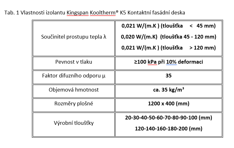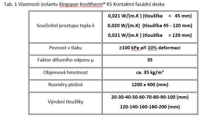 Jako tepelný izolant byla použita termoizolační deska Kingspan Kooltherm® K5 Kontaktní fasádní deska na bázi tvrzené fenolické pěny v tloušťce 50 mm. Zásadním technickým důvodem použití této desky jsou mimo mnoha dalších její vynikající tepelněizolační schopnosti umožňující splnění požadavků na tepelnou ochranu budovy při velmi malé tloušťce izolantu, dále zanedbatelná nasákavost a dostatečná tvarová stabilita zaručující stálé mechanicko-fyzikální parametry po celou dobu životnosti desky a v neposlední řadě vynikající odolnost vůči agresorům v podobě plísní, hub, hmyzu a ptákům, daná uzavřenou materiálovou strukturou a složením jádra a zesílenou textilní povrchovou úpravou.