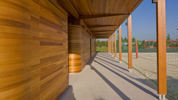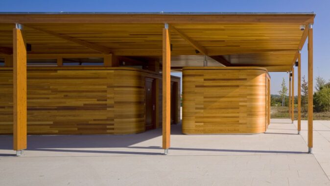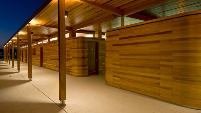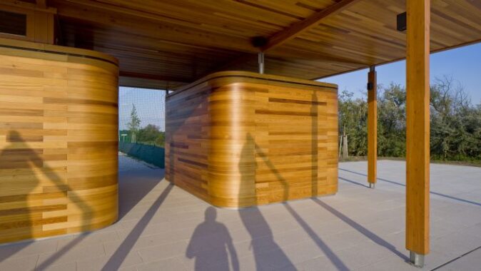 Přestože se jedná o relativně jednoduchou stavbu, prošla si překvapivě dlouhým a místy dramatickým vývojem. Náš názor se od expresivních návrhů postupně ustálil na klidnější, více archetypální dřevostavbě, která lépe podtrhuje neopakovatelné kouzlo zdejší historické parkové krajiny. Rovněž jsme ustoupili od původního návrhu, který počítal se dvěma samostatnými budovami, a dali přednost jednomu pavilonu s ochozem orientovaným do obou obsluhovaných stran areálu. Jemný odkaz na prvotní záměr tu přece jen je: pavilon totiž tvoří dvě oddělené hmoty, šatny pro sportovce s bufetem a skladem. Ty své místo nalezly pod baldachýnem jakoby plovoucí modřínové střechy a získaly obložení z kvalitního kanadského cedru. Od plochého krovu jsou pak vizuálně odděleny souvislými štěrbinami pásových oken.