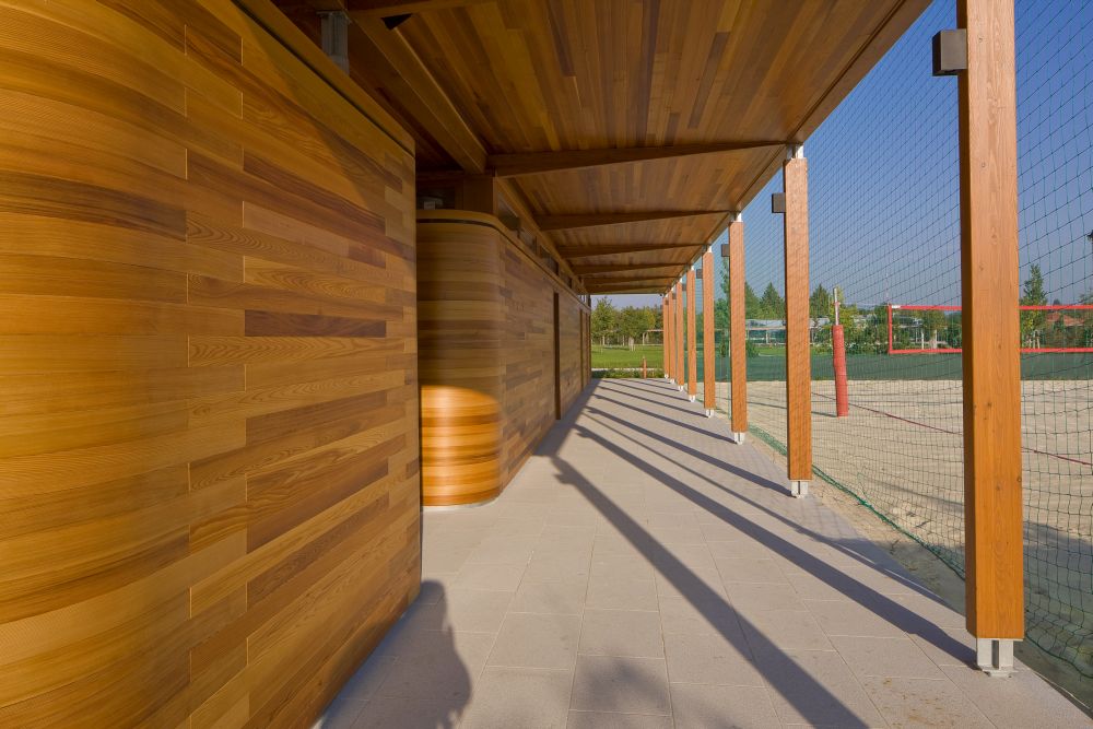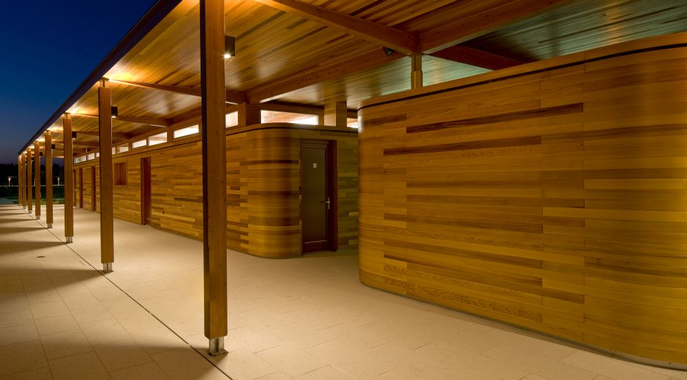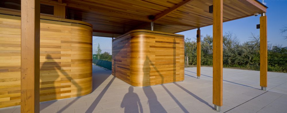 Přestože se jedná o relativně jednoduchou stavbu, prošla si překvapivě dlouhým a místy dramatickým vývojem. Náš názor se od expresivních návrhů postupně ustálil na klidnější, více archetypální dřevostavbě, která lépe podtrhuje neopakovatelné kouzlo zdejší historické parkové krajiny. Rovněž jsme ustoupili od původního návrhu, který počítal se dvěma samostatnými budovami, a dali přednost jednomu pavilonu s ochozem orientovaným do obou obsluhovaných stran areálu. Jemný odkaz na prvotní záměr tu přece jen je: pavilon totiž tvoří dvě oddělené hmoty, šatny pro sportovce s bufetem a skladem. Ty své místo nalezly pod baldachýnem jakoby plovoucí modřínové střechy a získaly obložení z kvalitního kanadského cedru. Od plochého krovu jsou pak vizuálně odděleny souvislými štěrbinami pásových oken.
