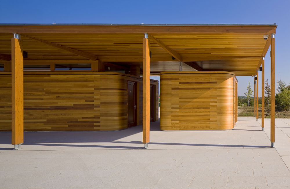 Obslužná budova sportovišť v novém parku u lázeňského hotelu