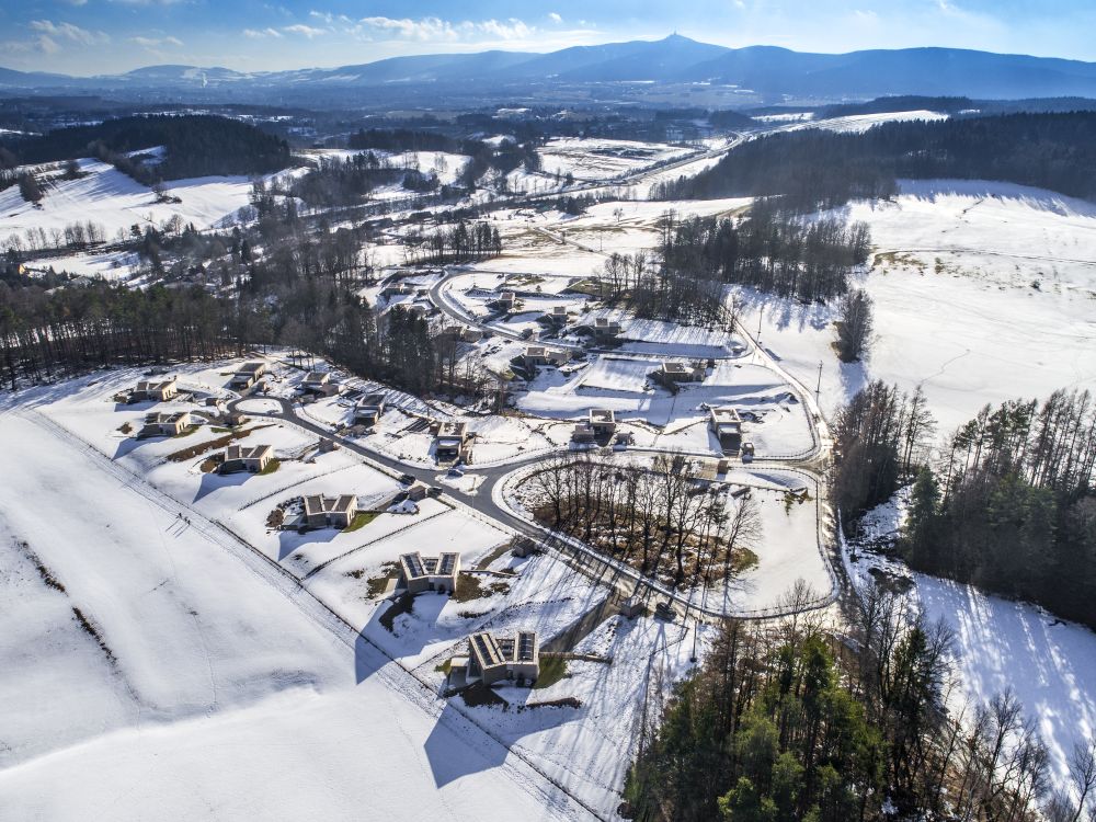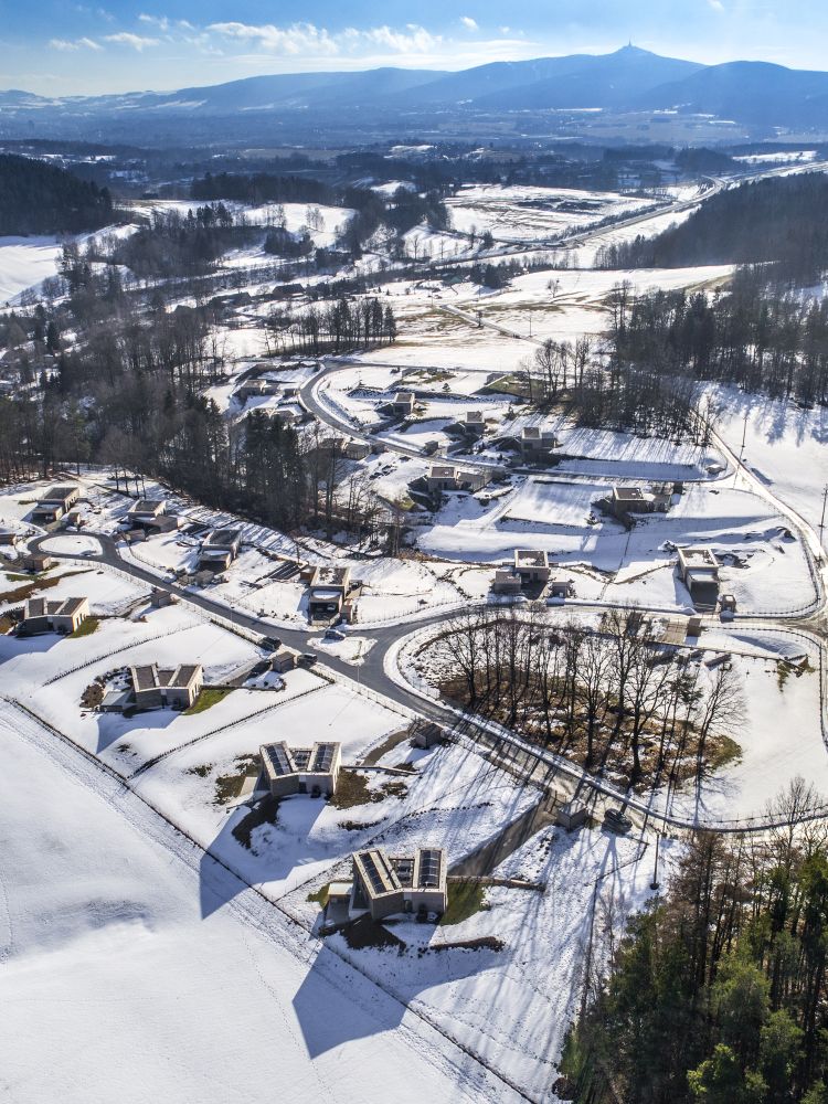 Projekt se vyvíjel ve dvou etapách. První byla zahájena v roce 2009. Zpracovali jsme ji na úrovni studie, která řešila především dopravní napojení, parcelaci a schematické dispoziční řešení. Podstatnou částí bylo nalezení architektonické formy. Vzhledem k nejasným majetkovým poměrům a problematickému způsobu zainvestování akce byl projekt v polovině roku 2010 ukončen. Druhá fáze nastala o pět let později. Projekt jsme rozšířili o území na protilehlém svahu, takže zástavba již není tak hustá jako v předchozí verzi. Vzhledem k rozšíření záběru se zvětšil počet domů na pět typů. Všechny se snaží obytnými prostory orientovat směrem na Ještěd.