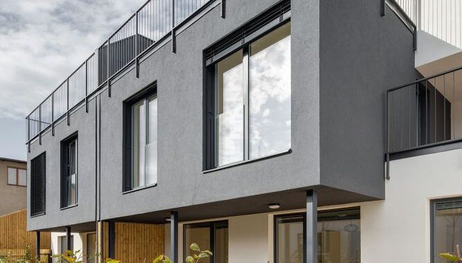 solitérních dvoupodlažních vil, respektuje kontext lokality. Do vnitrobloku se otevírá