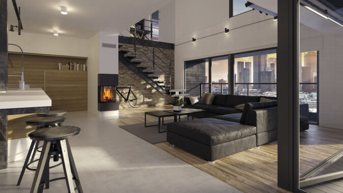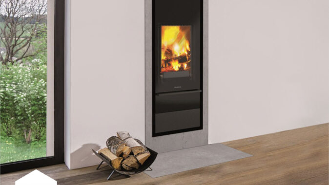Monolitický komínový systém se zabudovaným krbem zabírá plochu cca 45×45 cm,