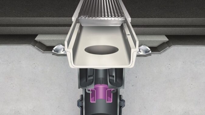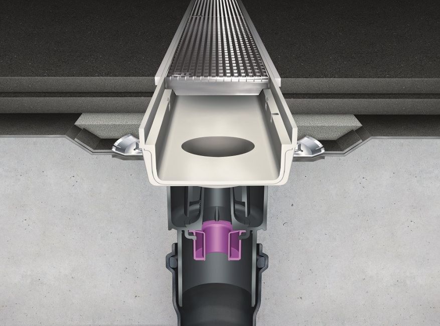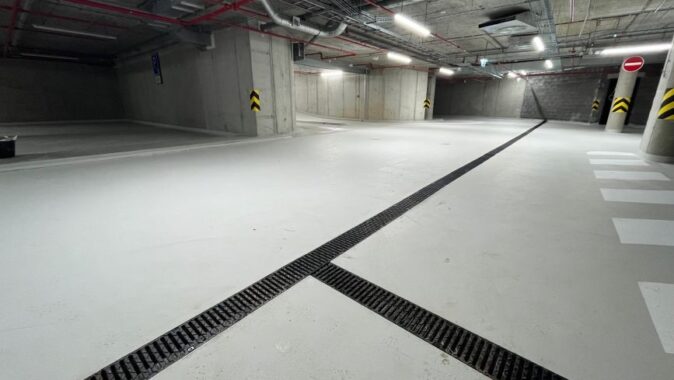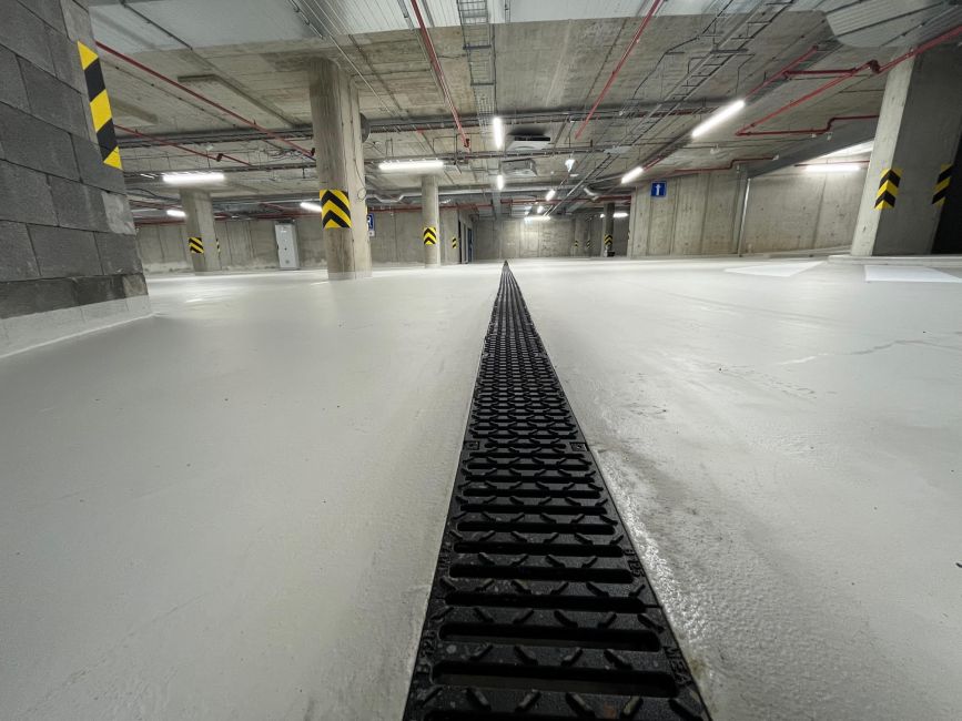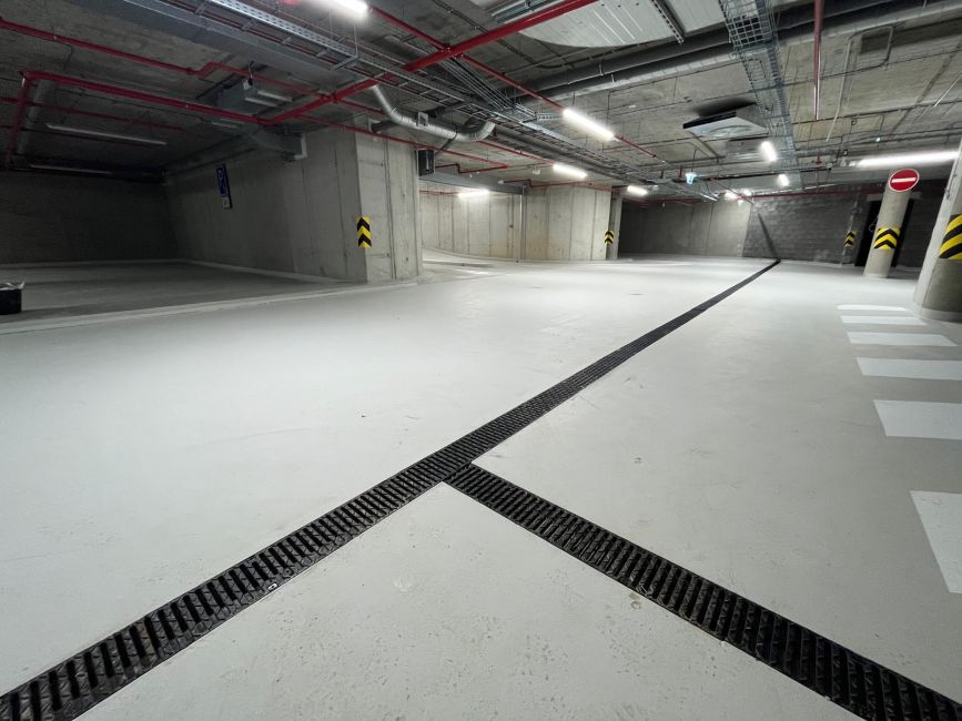 Snížené žlaby MEARIN PLUS F jsou i nižší, s výškou pouze 55 mm. V podzemních garážích se také často instalují kompozitní vypařovací žlaby PG1500 EVO, které jsou extrémně nízké – pouhých 30 mm. Instalace odvodňovacího systému byla provedena během 2 měsíců. Rychlé realizaci pomohla i technická podpora MEA přímo na stavbě.