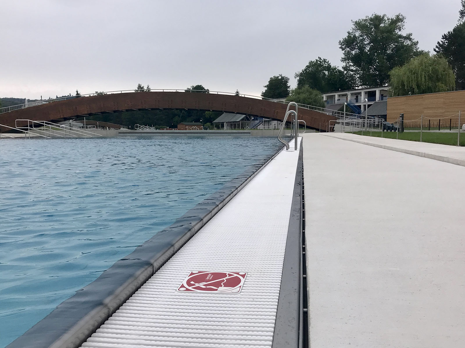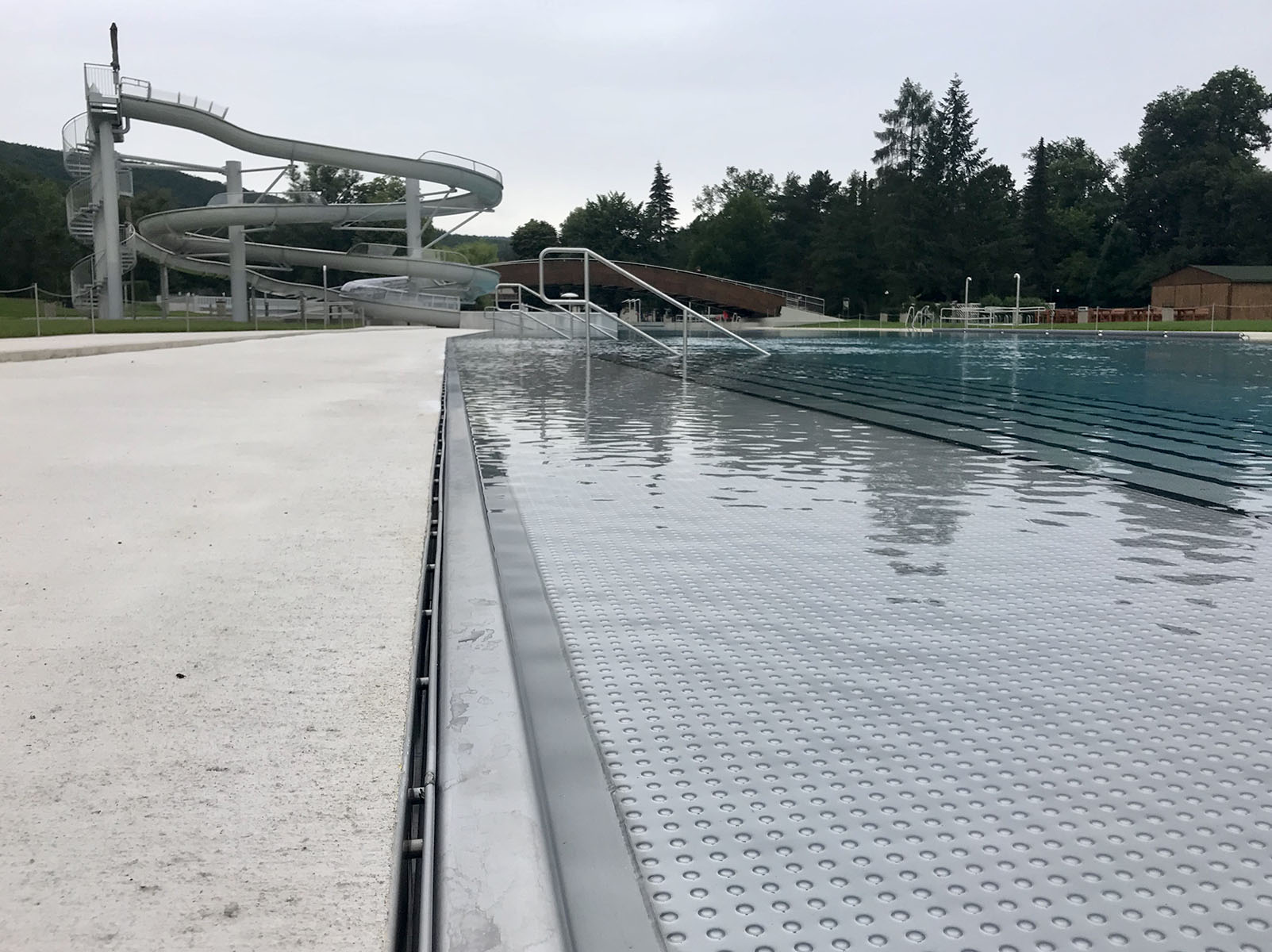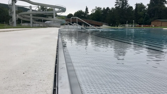 Pro projektanty bylo obtížným úkolem uspořádat jednotlivé trasy potrubních rozvodů mezi stávajícími bazény a strojovnou technologie tak, aby se trasy nekřížily. Potrubní rozvody jsou vedeny ve čtyřech výškových úrovních. Betonové vany nahradily moderní nerezové s integrovanými přelivovými žlaby. Odvod dešťových vod ze zpevněných ploch je tvořen nerezovými štěrbinovými kryty MEA, které jsou umístěny mezi chodníky z betonu a bazénovou vanou. Nerezový štěrbinový kryt MEA TSH 100 je vysoký pouze 100 mm, použitý v celkové délce 650 m, pod povrchem je rozšířen a posazen na sběrný kanálek z polymerbetonu. Tím je zajištěna dostatečná kapacita odvodňovacího systému. Čistící prvky jsou osazeny pravidelně pro zajištění efektivního čistění. Štěrbinové žlaby MEA TSH 100 se používají také pro odvodnění pěších zón, náměstí nebo na jiných designově náročných plochách.
