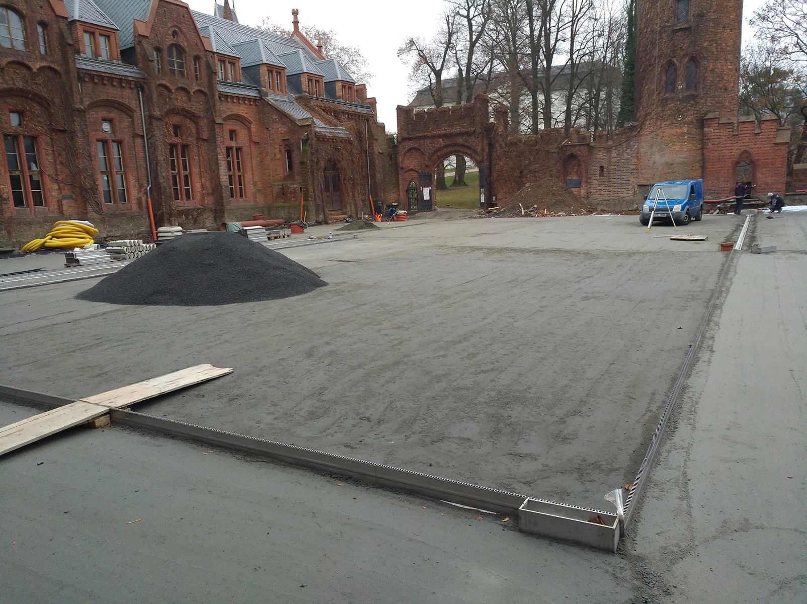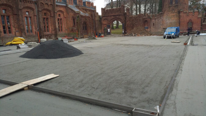 nádvoří bylo nutné navrhnout i způsob odvodnění plochy tak, aby bylo možné