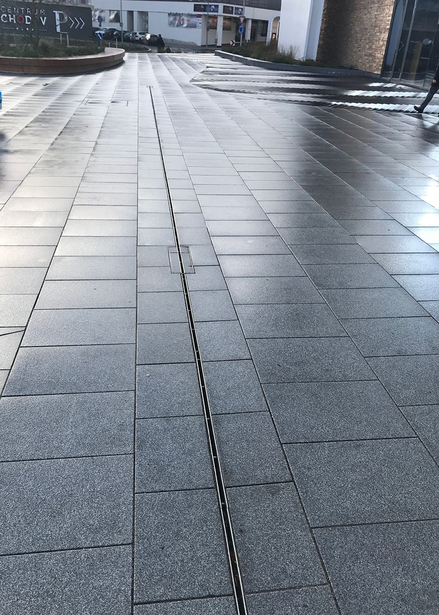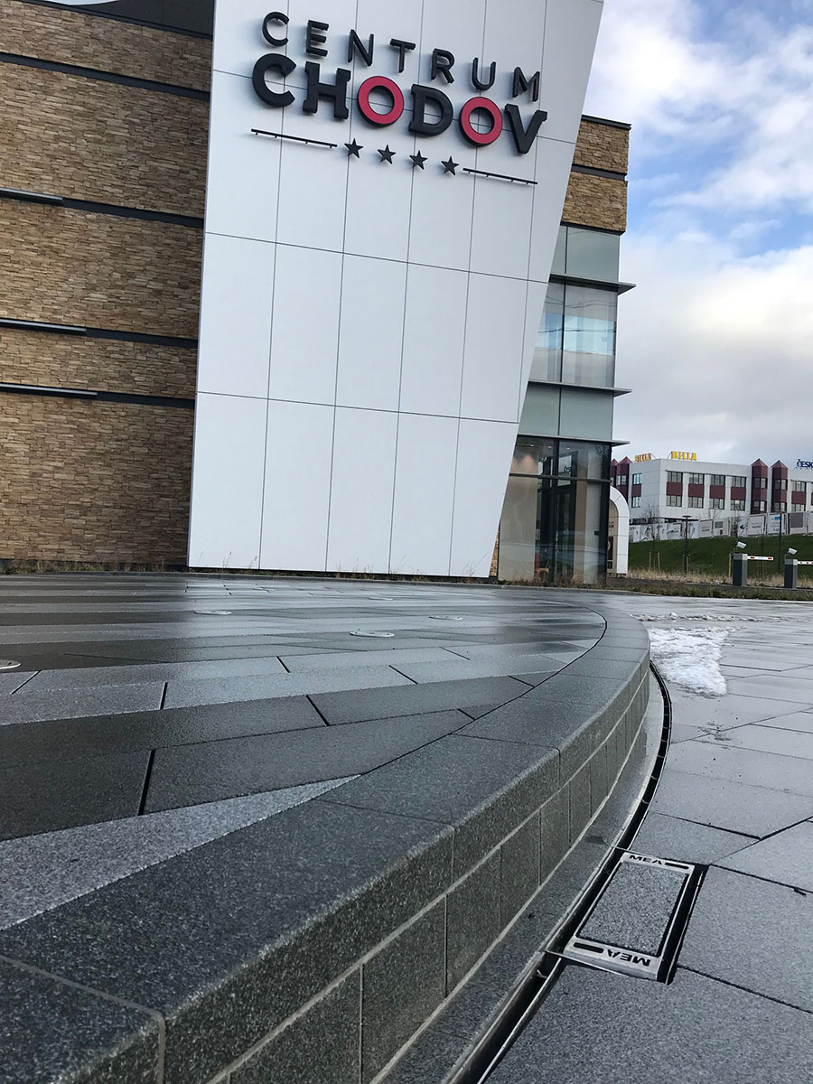 Jedno z největších nákupních center v České republice, OC Chodov Praha, otevřelo po dostavbě novou část koncem roku 2017. Kromě uzavřených objektů jsou součástí komplexu i náměstí a venkovní plochy pro volnočasové aktivity. Vysoké architektonické požadavky musely splnit i technické detaily návrhu. Jedním z nich bylo i nenápadné odvodnění zpevněných ploch a stavebních prvků v místech, kde se pohybuje velké množství osob.