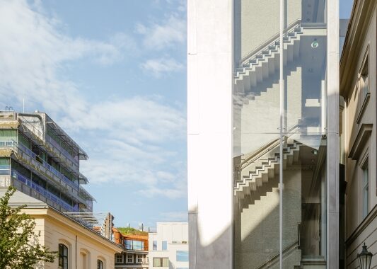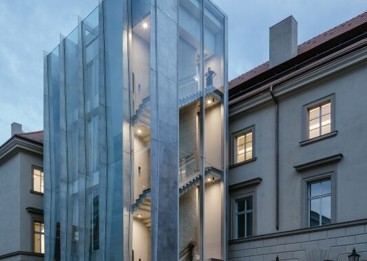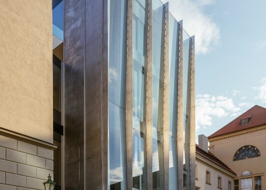 baroknímu klášteru v Hybernské ulici připojilo technicistní věž ze skla a