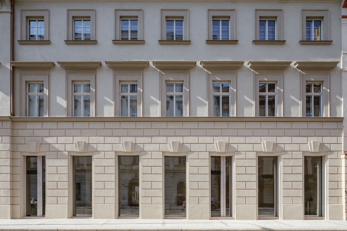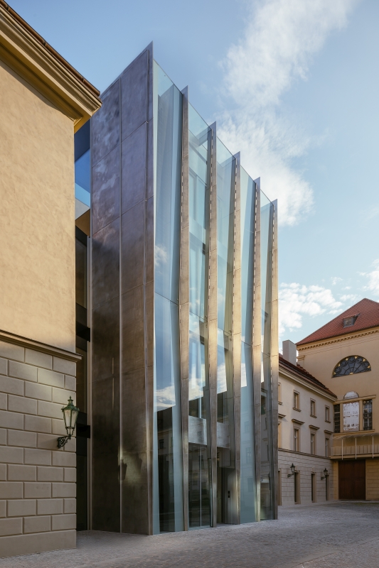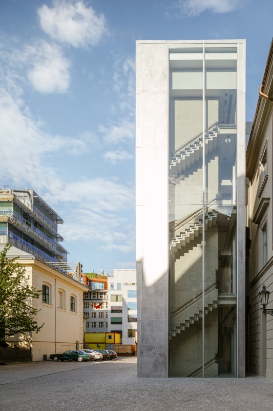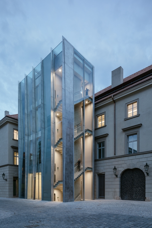 baroknímu klášteru v Hybernské ulici připojilo technicistní věž ze skla a
