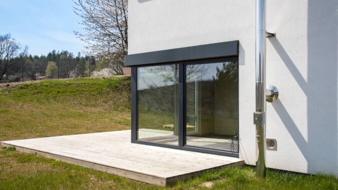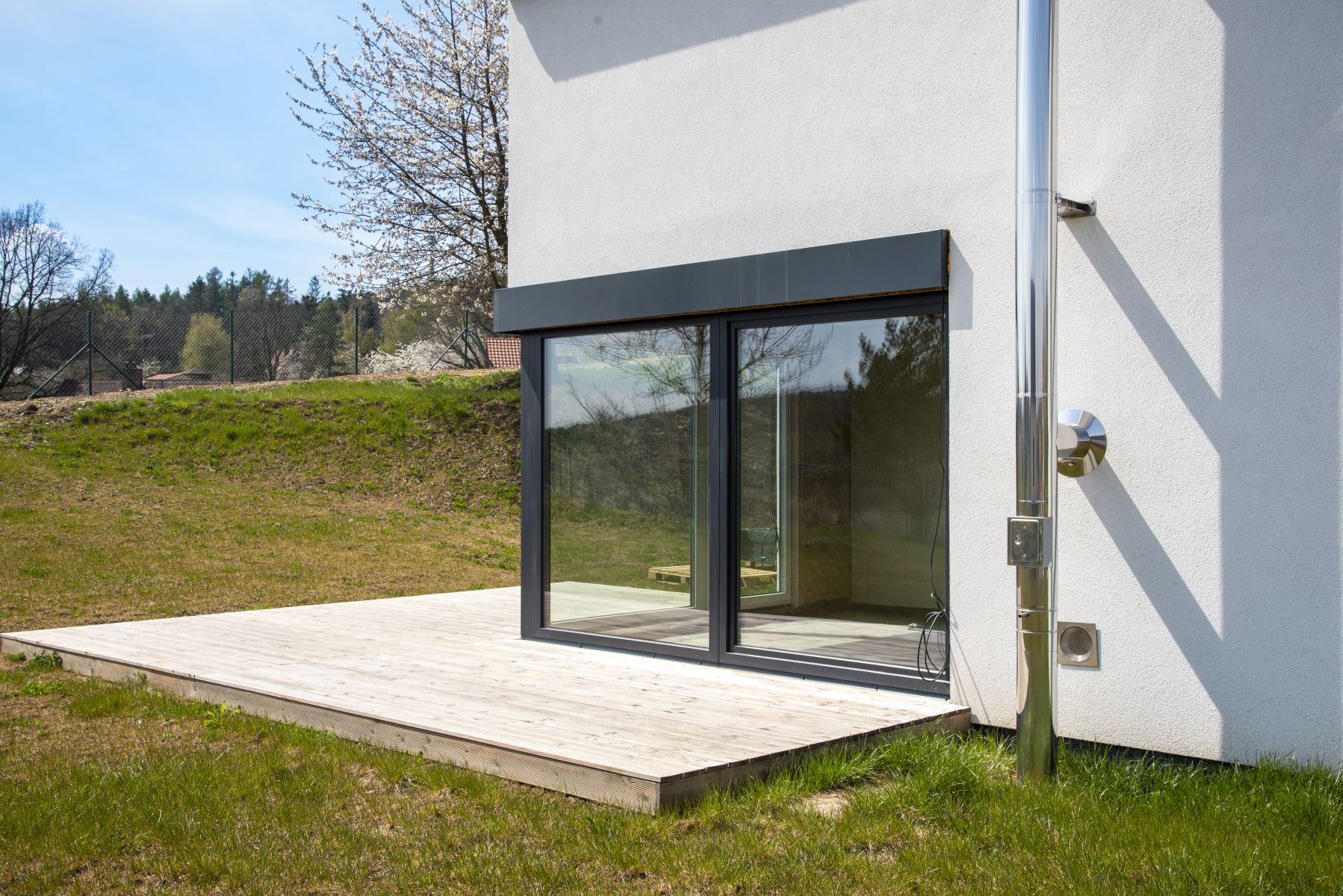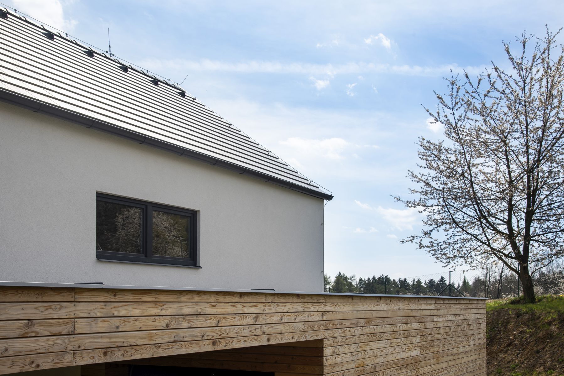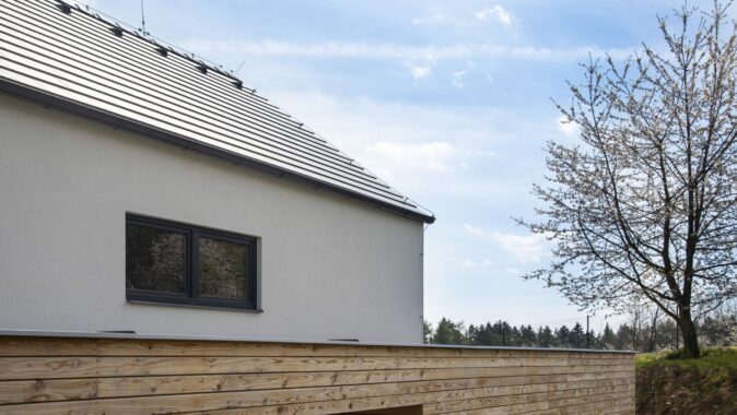V exteriéru vidíme již zmíněný antracitový odstín, který je mezi investory stále velmi populární, zatímco v interiéru mají okna bílou neutrální barvu. Antracitové zbarvení profilů klade v letních měsících větší nároky na tvarovou stabilitu zejména u velkých formátů, ale díky kvalitě plastů, která je typická právě u REHAU, je toto spolehlivě zajištěno i u velkoformátového PSK systému. Výhodou okenních profilů REHAU je povrchová úprava usnadňující údržbu a také zabezpečení proti vloupání, které je zejména u rodinných domů důležité. Okna lze na přání rovněž osadit systémem Smart Guard, to znamená inteligentním senzorem preventivní ochrany, jež má za úkol odradit případného lupiče. V domech najdeme kromě oken také vstupní dveře SYNEGO.