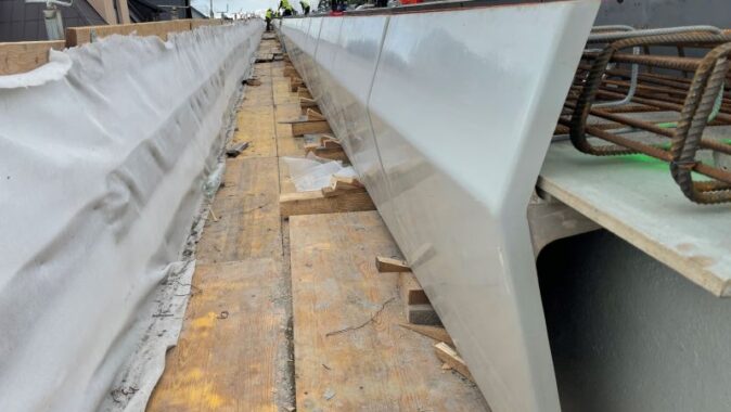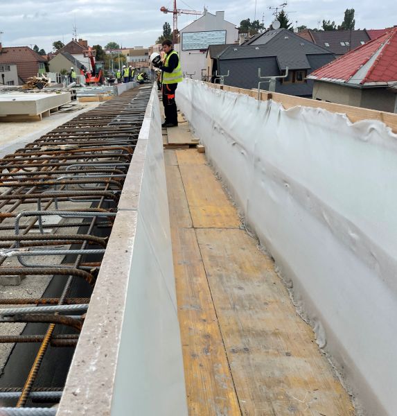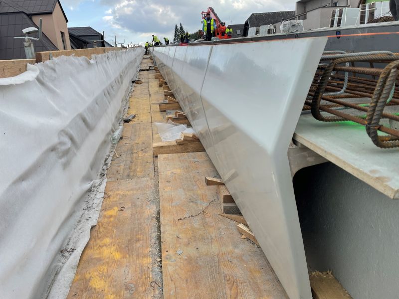 Rekonstrukce mostu Kyjevská v Pardubicích nad železniční tratí je komplikovanější kvůli zjištění azbestu, špatným ložiskům i pilířům. Předpokládá se, že potrvá do jara roku 2022. Loni na podzim proběhla oprava vrchních částí mostu, do kterých patří i instalace pohledových mostních říms v délce 730 bm. Mostní římsy z polymerbetonu se vyrábí jako prefabrikované díly s nízkou hmotností. Slouží současně také jako šalovací prvek pro jejich zabetonování.