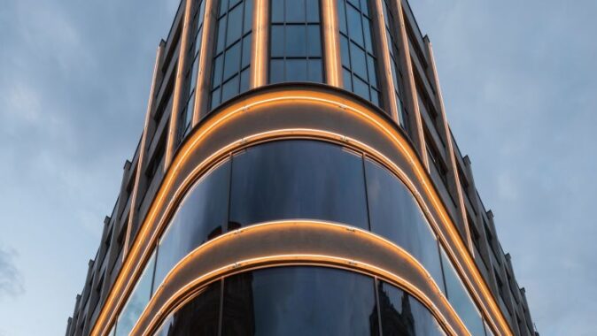 návrhu osvětlení fasády včetně nápisu na střeše budovy. Cílem bylo navrátit