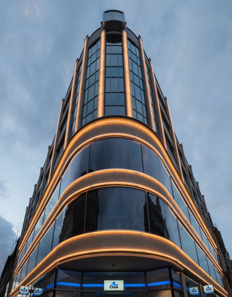 návrhu osvětlení fasády včetně nápisu na střeše budovy. Cílem bylo navrátit
