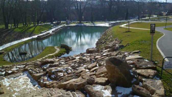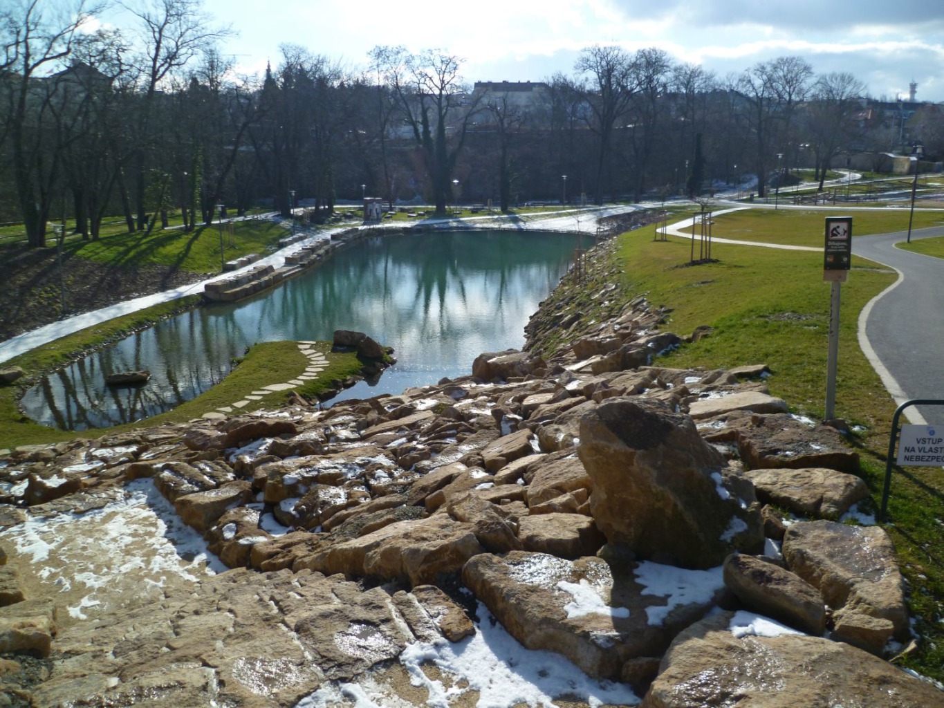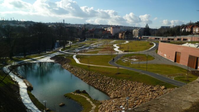 přírodně tvarovaná vodní plocha rybníka U šancí a lineární vodní prvek ve stopě