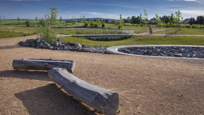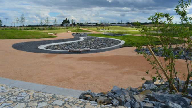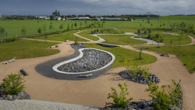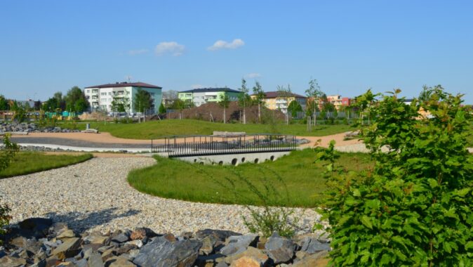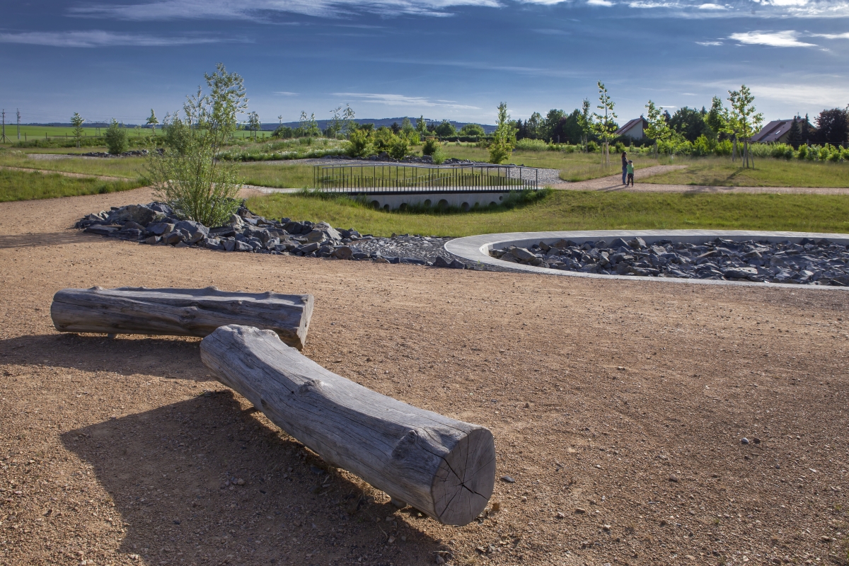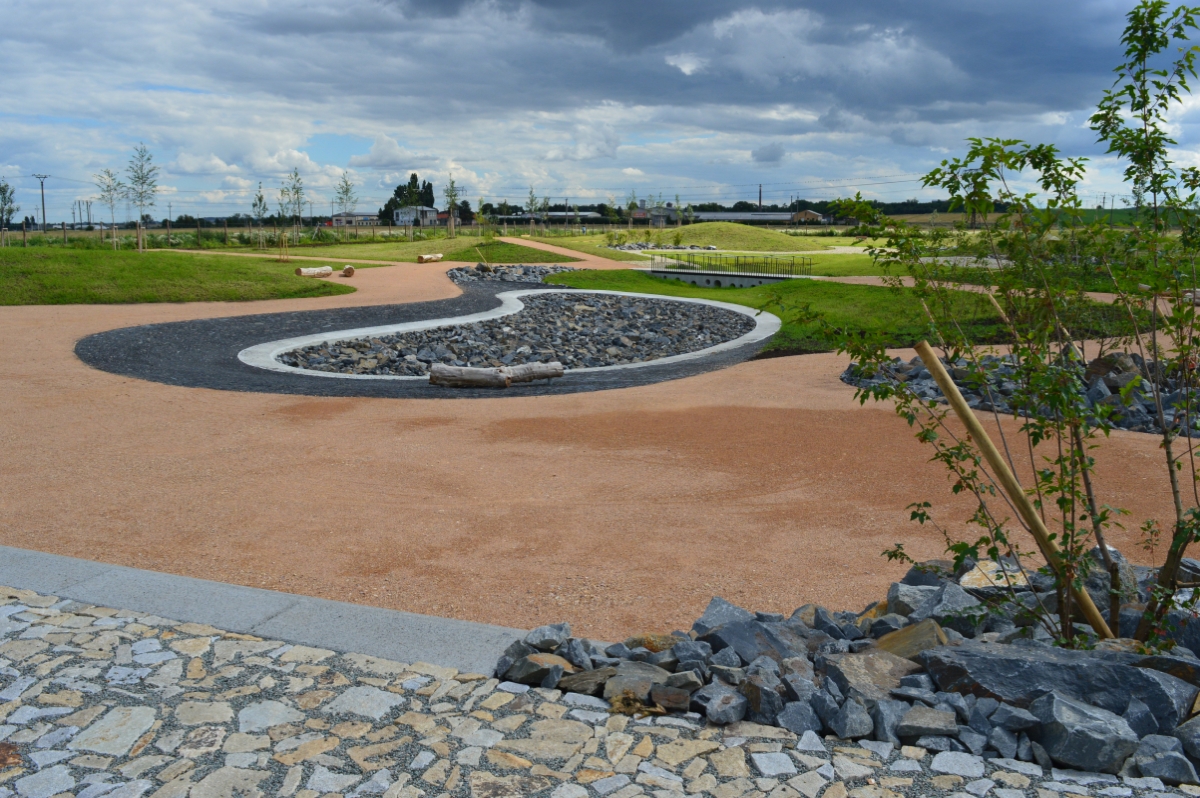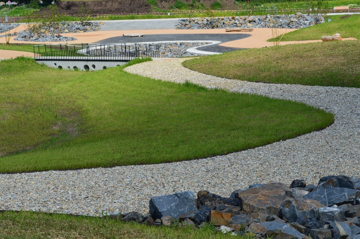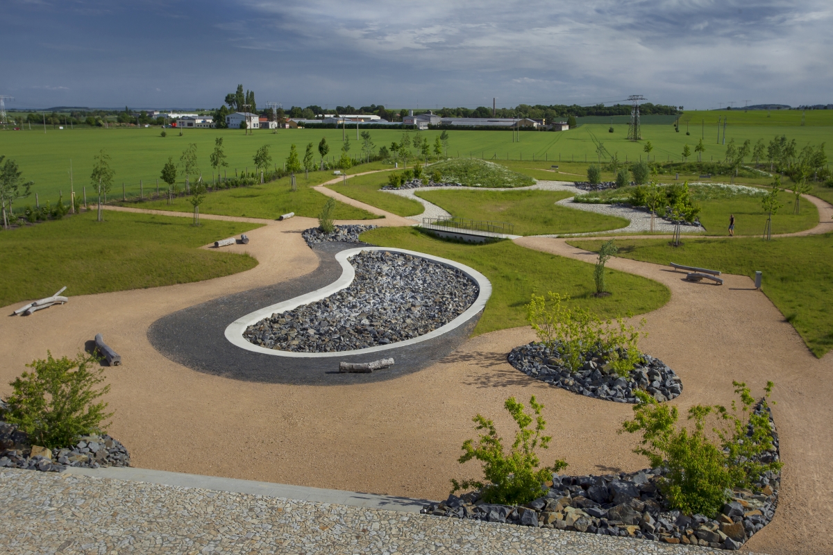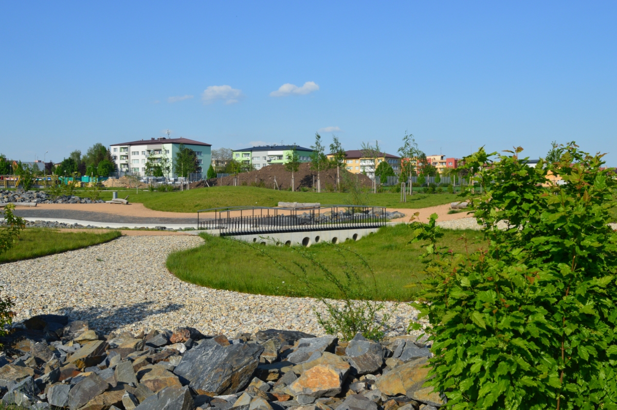 To nás inspirovalo k řešení stanoveného cíle, který byl využít vodu z budoucích střech a zadržet dešťovou vodu co nejefektivněji na místě pro zdárný vývoj vegetace. Námi stanovený cíl měl být kontaktní vodní prvek, tedy dílo, které by umožnilo vstup do vody bez nebezpečí utonutí, voda v něm by se měla udržet relativně čistá po celý rok, a i za podmínek velkého sucha by byla šance, že voda nezmizí. Dále to celé uskutečnit bez potřeby vstupní energie pro technologické vystrojení.
