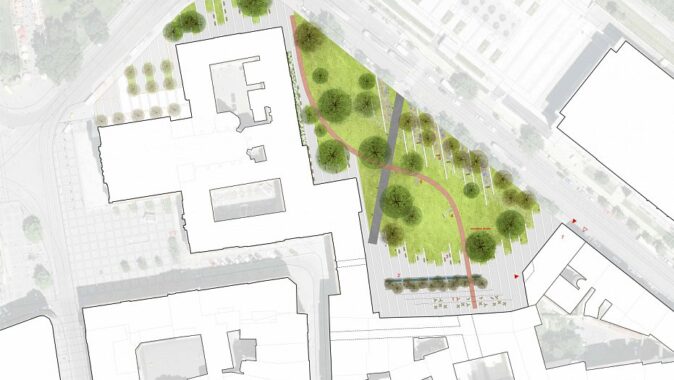 „Cílem našeho návrhu bylo vytvoření fungujícího urbanistického řešení vedoucího k prostupnosti a otevřenosti parku a stanovení logických pěších tras. V současné době není uliční fronta důležitého městského bloku adekvátně zakončena a jižní část parku je utvořena nesourodou strukturou staveb. Naše urbanistické řešení vychází především z uzavření tohoto významného městského bloku novým domem. Navržený dům společně s plánovanou navazující zástavbou dále vymezuje nový veřejný prostor, do kterého se otevírají partery domů. Vznikne tak živý městský prostor s novými terasami pro letní zahrádky a volné posezení a s novým vodním prvkem a stromořadím, které definuje hranu veřejného předprostoru budov. Stanovení pěších tras parkem respektuje stávající hlavní trasy, které pouze mírně upravuje. Nově navrhujeme cestu, která se volně vine parkem a propojuje důležitá místa v parku, kterými jsou jeho severní a jižní část a předprostor u Moravské galerie. Cesta dále lemuje stávající prvky v parku jako je socha Jiřího Mahena, archeologické naleziště předbraní a památný strom. Zároveň se podél ní mohou vystavovat nová umělecká díla. Proto tuto cestu také nazýváme cestou galerijní. Tím, jak se cesta vine parkem, zároveň zpřístupňuje jeho travnaté plochy pro relaxační a pobytové využití.