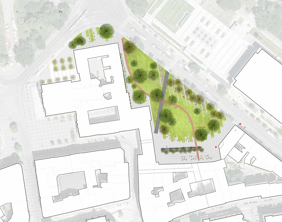 Navržená modelace terénu, pěší trasy a zpevněné plochy, se snaží maximálně respektovat kořenový systém parku. Podél ulice Rooseveltova navrhujeme nový pás záhonů z travin a trvalek, který definuje hranu původního hradebního opevnění,“