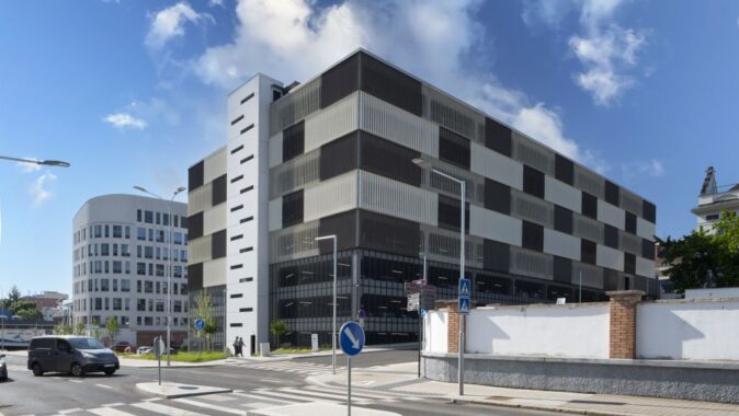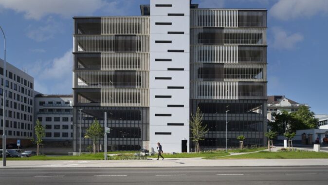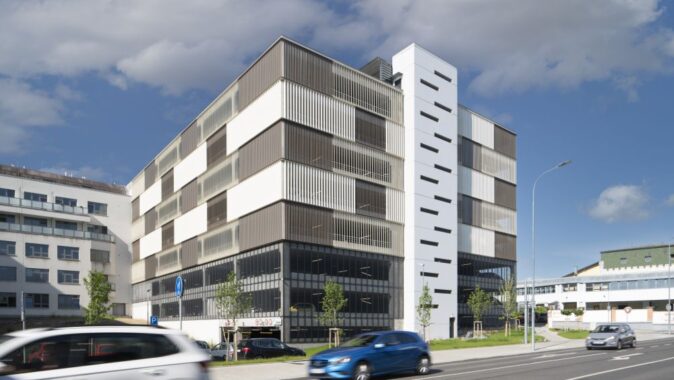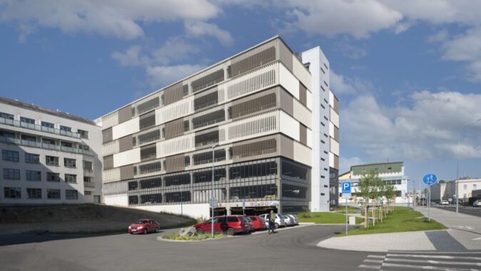 Západní část parkovacího domu se skrývá pod úrovní terénu, na střeše je pozemní parkoviště. Hmotově budova navazuje na okolní zástavbu, kterou nepřevyšuje, ale doplňuje.