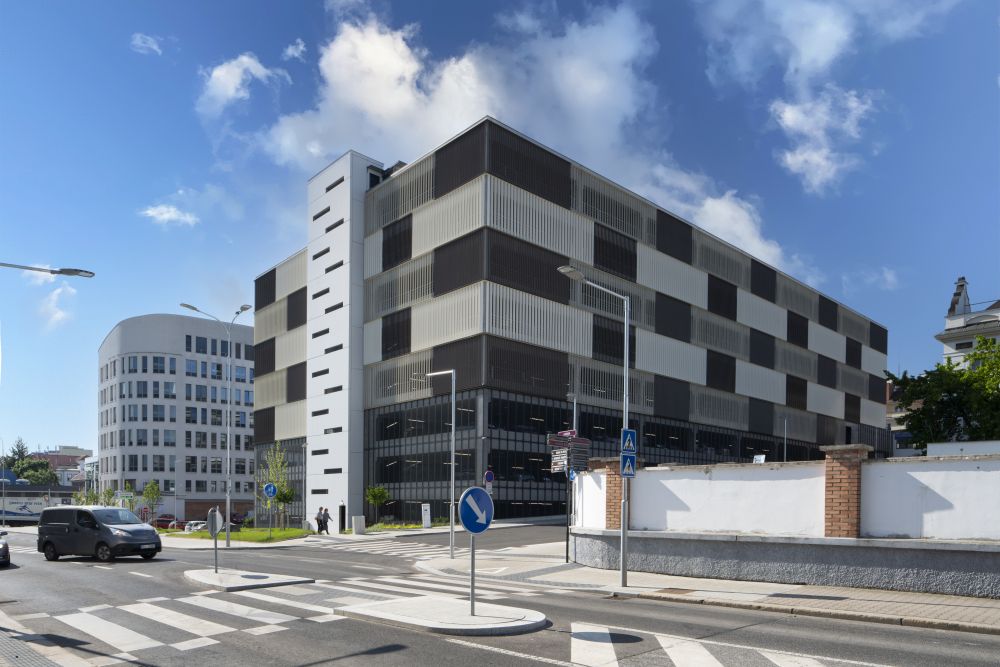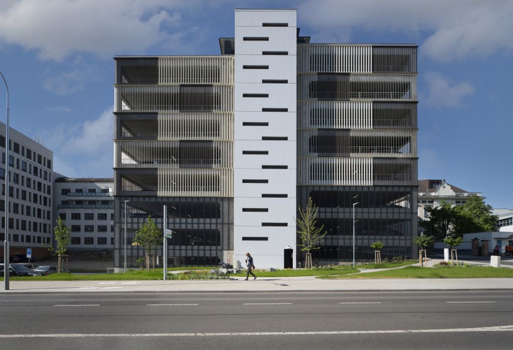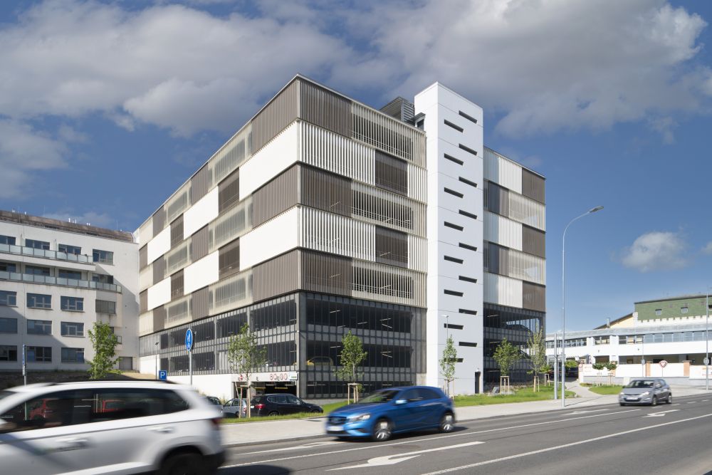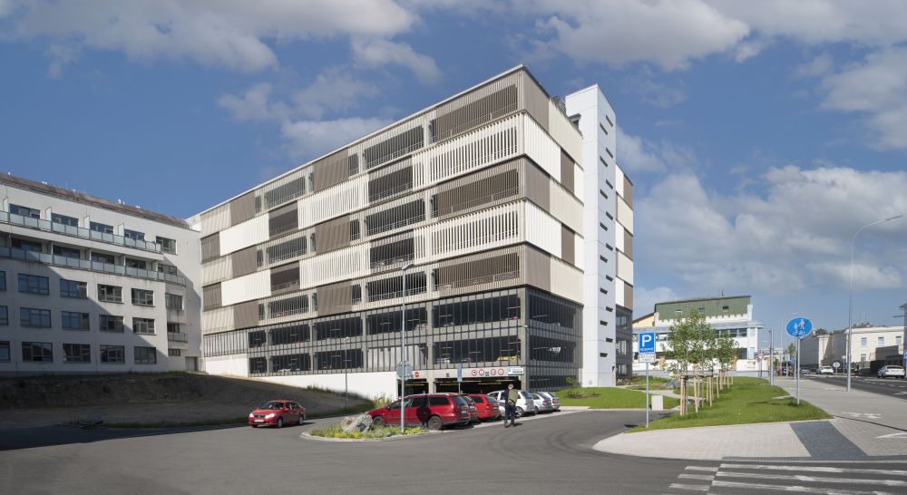 Západní část parkovacího domu se skrývá pod úrovní terénu, na střeše je pozemní parkoviště. Hmotově budova navazuje na okolní zástavbu, kterou nepřevyšuje, ale doplňuje.