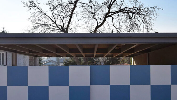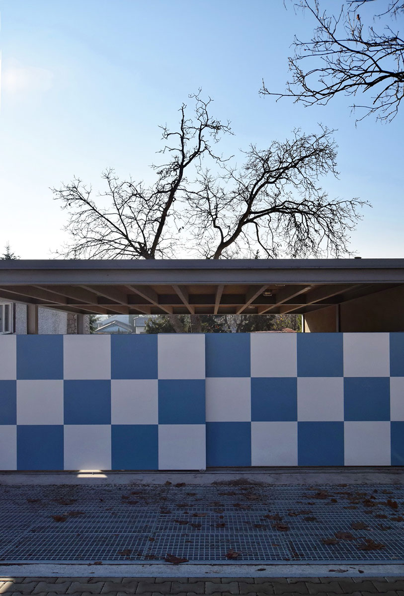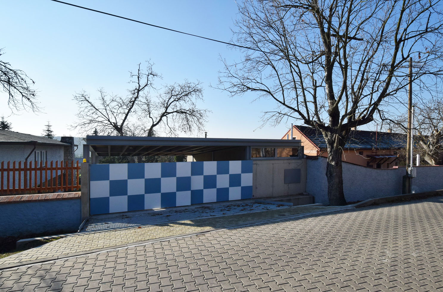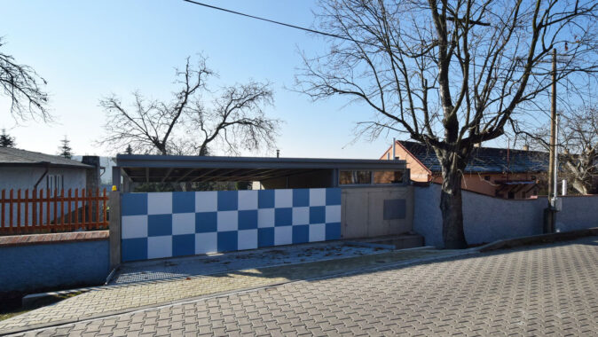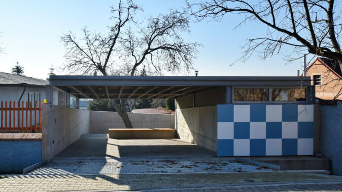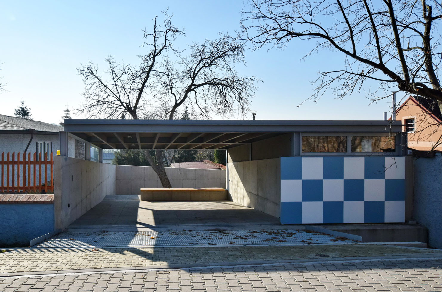 Sestává z parkovacího stání pro dva automobily, otevřeného do malého dvorku s