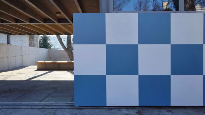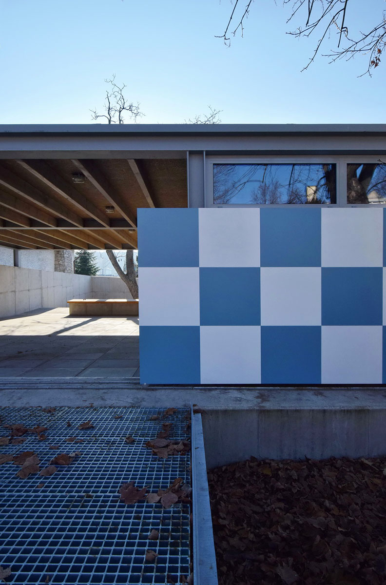 Materiály: pohledový beton na hraničních stěnách, betonová dlažba, nosná ocelová konstrukce střechy i lávky, dřevěné trámy zaklopené OSB deskou. Vše v odstínech šedé barvy, vyjma dveří a vrat v modrobílém provedení a barevného vedení médií.