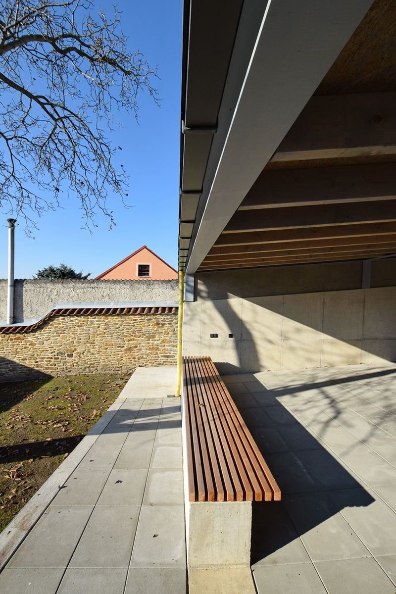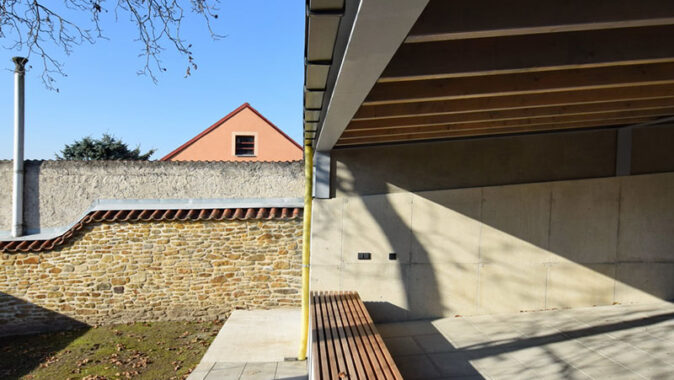 ze dvorku. Oba prostory jsou zastřešeny pultovou střechou. Stání pro automobily