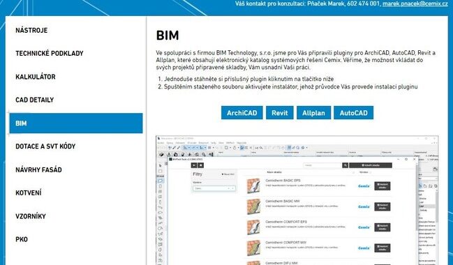 V sekci CAD detailů jsou k dispozici podklady pro stavební řešení CEMIX. Soubory s CAD detaily jsou ve formátu DXF a je možné je stáhnout ve dvou variantách, a to buď jako detail s výrobky Cemix, nebo jako detail s obecným popisem. Systém nabízí BIM, systémové skladby a pluginy pro ArchiCAD, AutoCAD, Revit a Allplan, které obsahují elektronický katalog systémových řešení Cemix. Možnost vkládat do projektů už připravené skladby zcela jistě velmi usnadní práci.