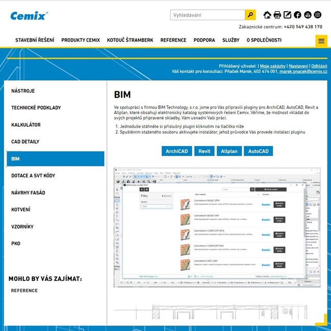V sekci CAD detailů jsou k dispozici podklady pro stavební řešení CEMIX. Soubory s CAD detaily jsou ve formátu DXF a je možné je stáhnout ve dvou variantách, a to buď jako detail s výrobky Cemix, nebo jako detail s obecným popisem. Systém nabízí BIM, systémové skladby a pluginy pro ArchiCAD, AutoCAD, Revit a Allplan, které obsahují elektronický katalog systémových řešení Cemix. Možnost vkládat do projektů už připravené skladby zcela jistě velmi usnadní práci.