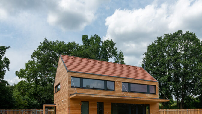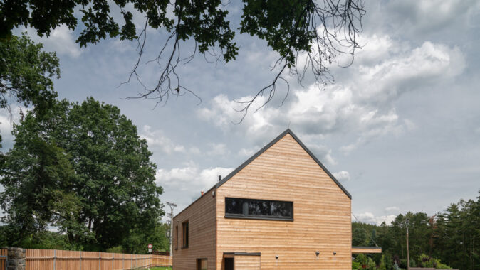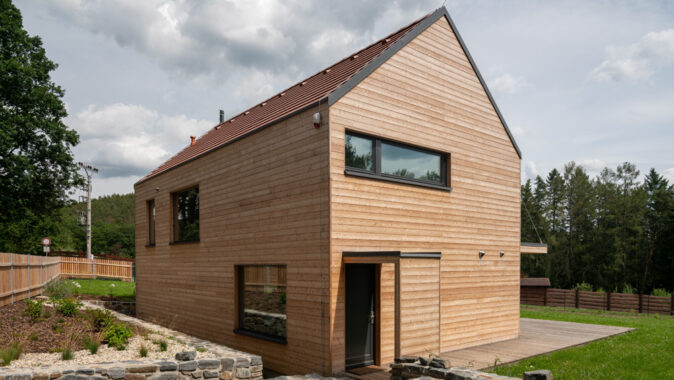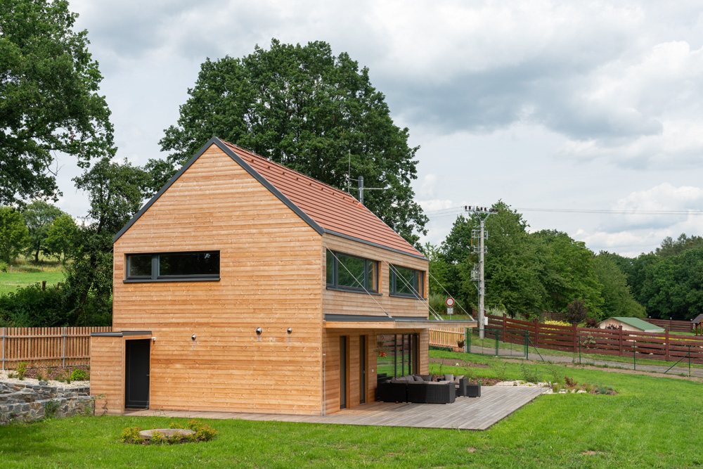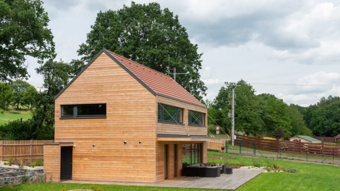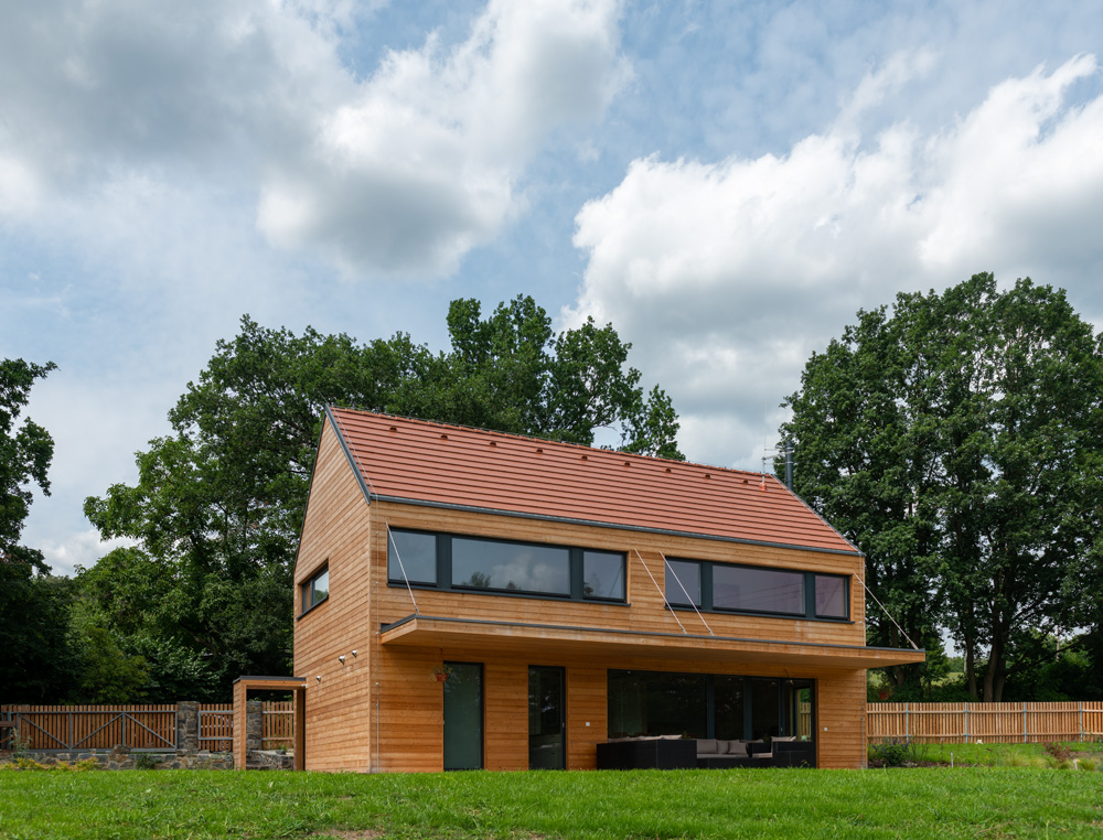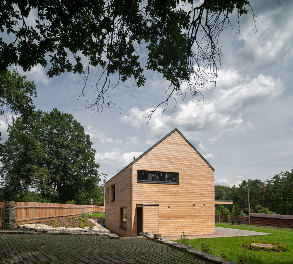 Dispozice byly ovlivněny požadavkem investora na společné prostory. Jelikož dům nyní slouží převážně k rekreačním účelům, je tomuto přání podřízen obytný prostor, který je zároveň propojen s velkou terasou. Ta slouží v letních měsících jako pasivní stínění prosklené stěny obývacího pokoje. Aby bylo docíleno segregace klidové a pobytové části, byl vstup na schodiště umístěn do zádveří, čímž došlo k eliminaci přenosu hluku z pobytové části přes schodiště do patra. V patře je součástí chodby malá čítárna s knihovnou. Je zde samostatné wc, koupelna, ložnice a dva velké pokoje.