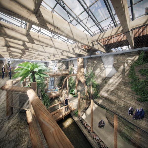 velké venkovní expozice (voliéry pro šimpanze), vybudování jeskyně, pozorovací místnosti, nového občerstvení a výběhu
