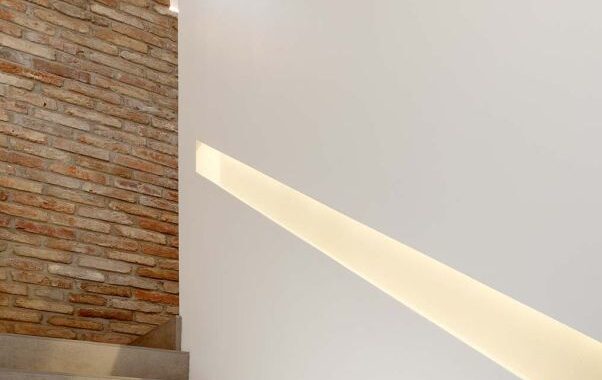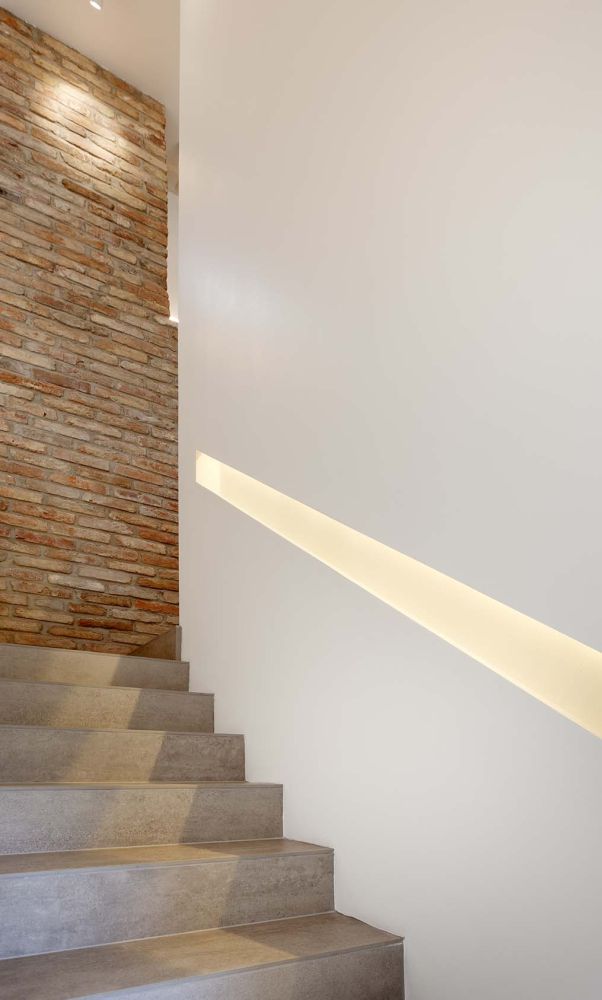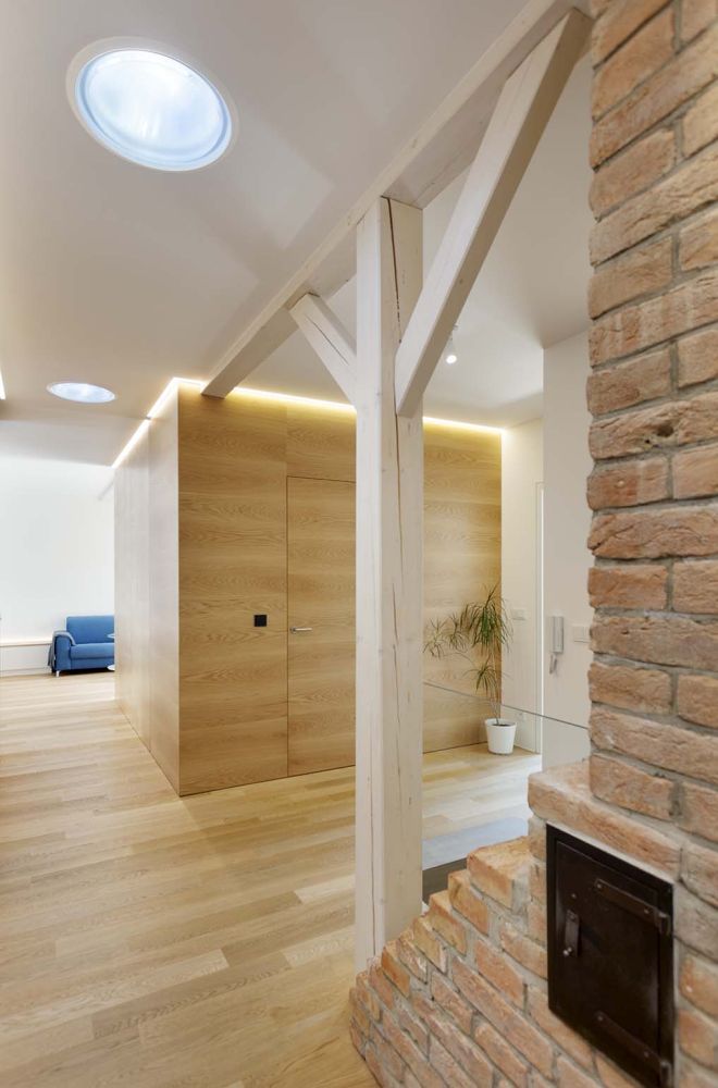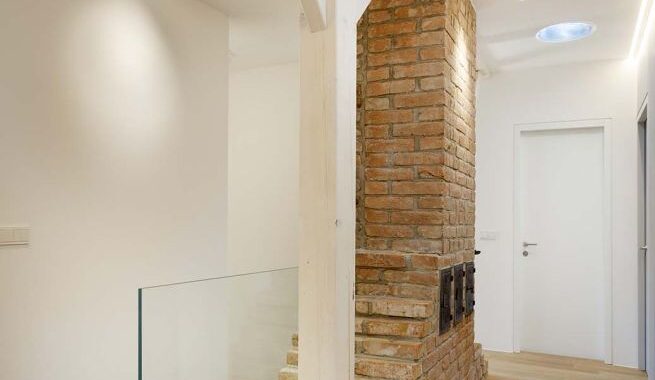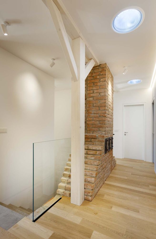 těleso z pohledových cihel, do chodby je vložená šedá plocha stěny s dveřmi.