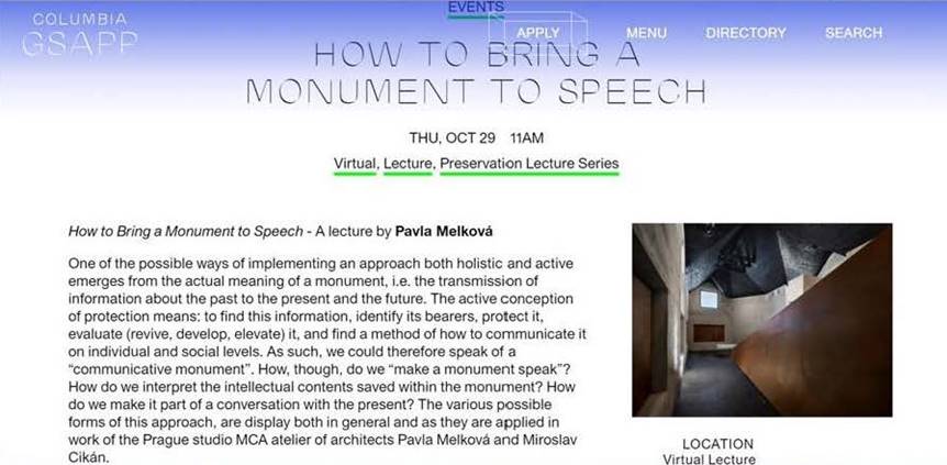 Kolumbijská univerzita srdečně zve na online přednášku Pavly Melkové How to Bring a Monument to Speech. Přednáška se koná ve čtvrtek 29. října od 16 hodin v rámci cyklu přednášek o ochraně iniciované Programem památkové péče Columbia University Graduate School of Architecture, Planning and Preservation.