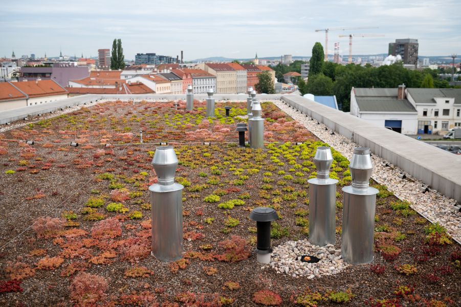 Podobně jako výsadba nové zeleně fungují i zelené prvky na samotných budovách. Funkční zelená střecha či fasáda absorbují mnohem méně slunečních paprsků než betonový povrch, navíc pomáhají odebírat teplo ze svého okolí. „Zelená fasáda či střecha zároveň snižuje energetickou náročnost budovy, která se díky ní tolik nevyhřívá a snižují se tak například náklady na klimatizaci kanceláří či bytů,“ sdělil technický správce Inovačního centra SVATOPETRSKÁ v Brně Vlastimil Rieger.