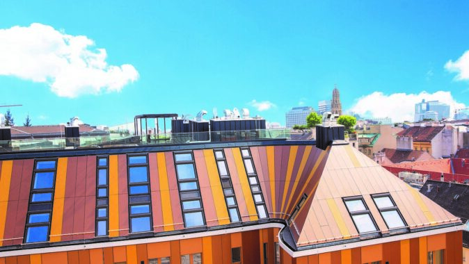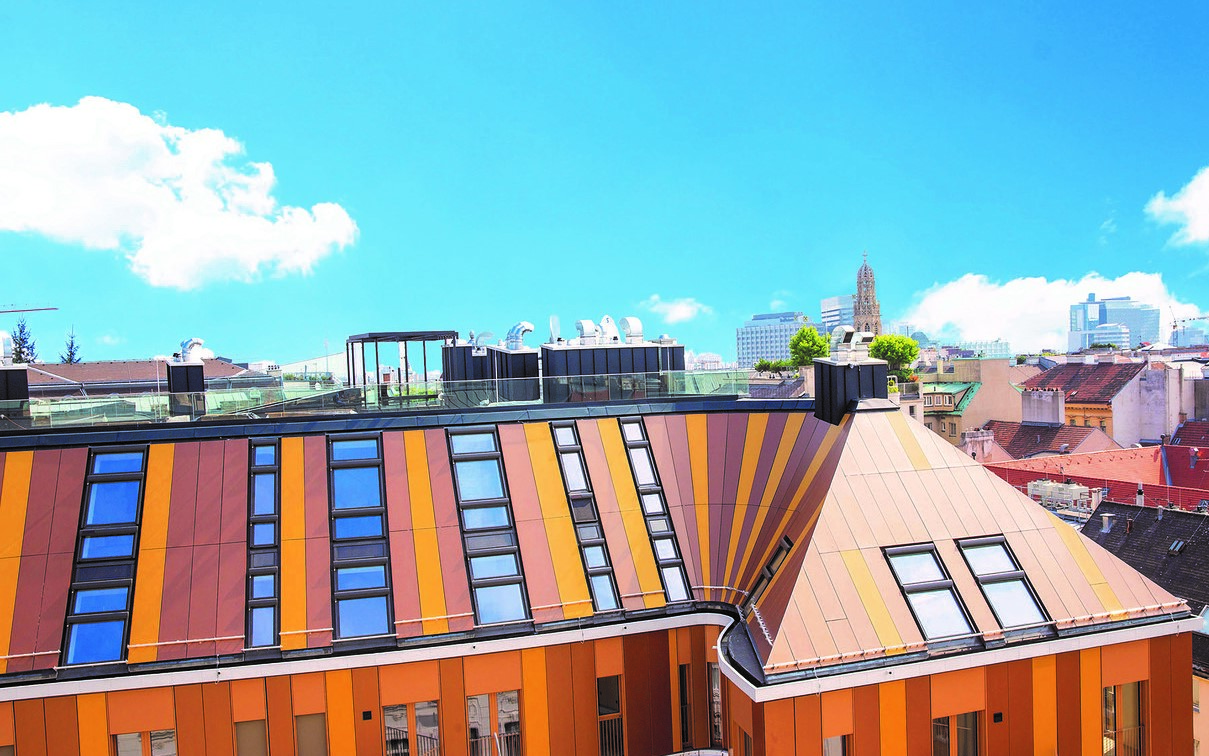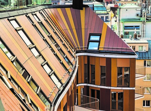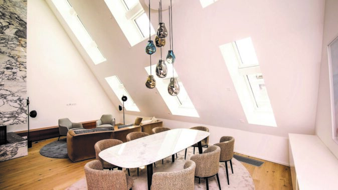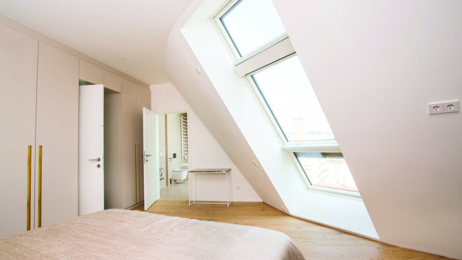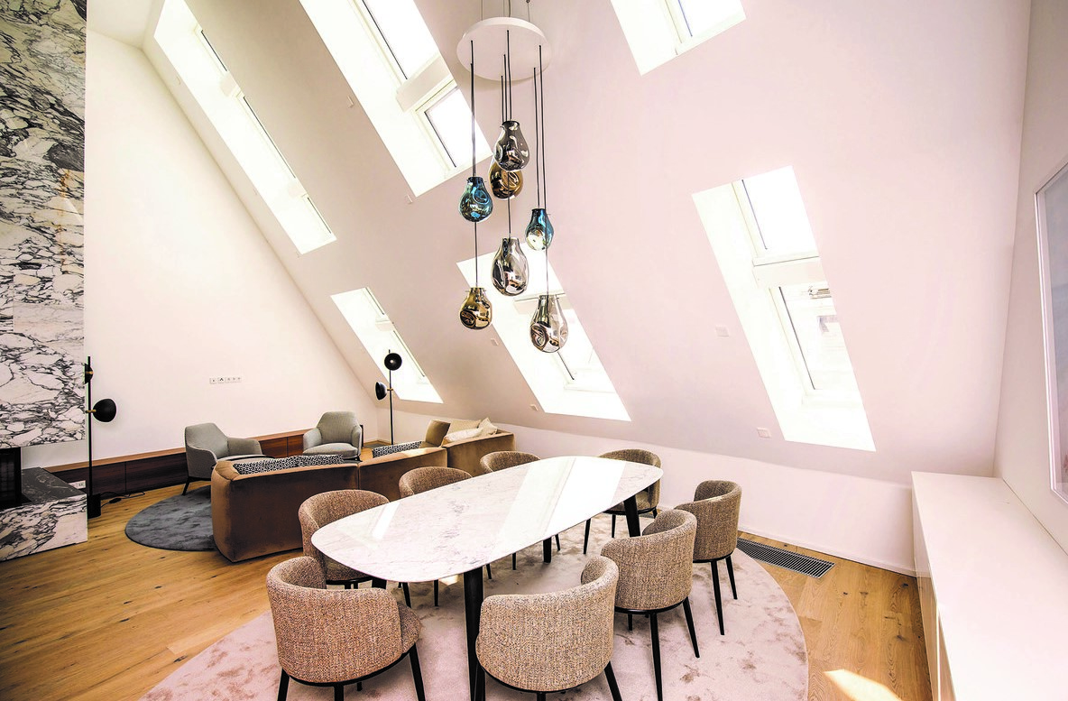 Elektricky ovládaná střešní okna naplňují podkrovní apartmány spoustou přirozeného světla a podtrhují nápaditou architekturu budovy