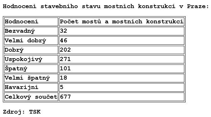 (ČTK) – Více než stovka pražských mostů je ve špatném technickém stavu, 18 mostů je ve velmi špatném a pět dokonce v havarijním stavu. Vyplývá to z materiálu Technické správy komunikací (TSK) pro pražskou radu, který má ČTK k dispozici. O jaké mosty konkrétně jde, TSK ČTK nesdělila. V metropoli je 677 mostů, z toho 594 v majetku magistrátu.