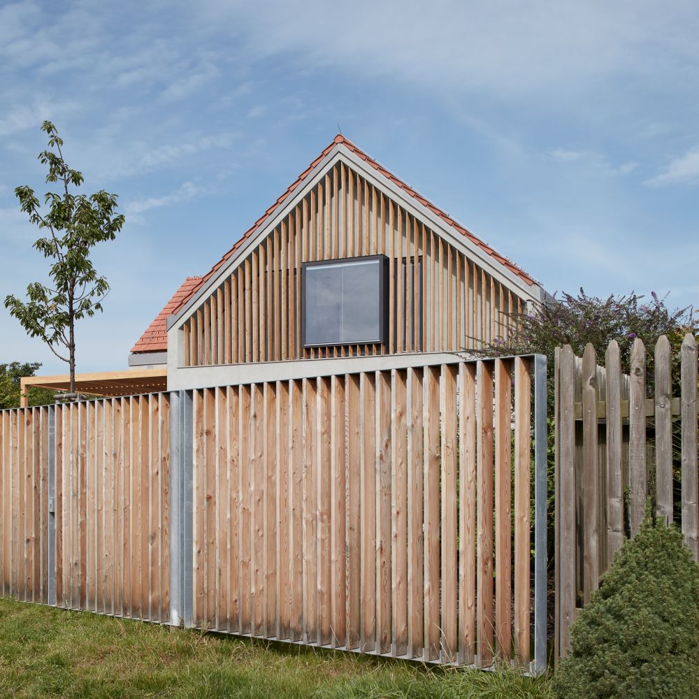 Použití svislých dřevěných lamel na štítu je skvělý nápad pro zachování vesnického prostředí, kde by celoplošné prosklení bylo moc. A vsazení okna mezi lamely je parádní třešnička na dortu.