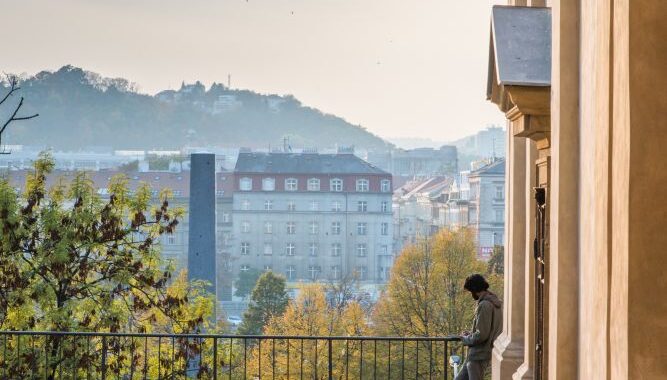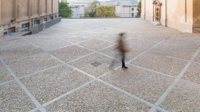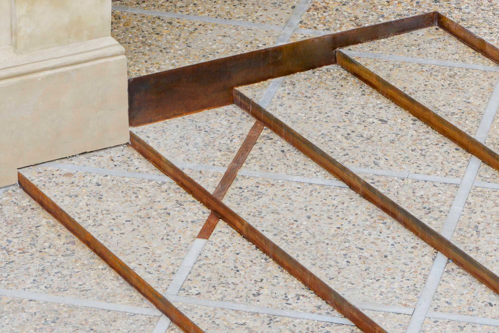 Sjednocení plochy sevřené kaplí sv. Kosmy a Damiána, kostelem Panny Marie a křídlem dermatologického ústavu je provedeno jako geometrizovaná struktura sestavená z tradičních materiálů. S celou plochou pracujeme jako s koláčem, jehož jednotlivé díly zvednuté z podložky odhalují v místech řezů základní hmotu – ocelový plech. Pro diagonální rastrování, inspirované původní výdlažbou vstupního nádvoří před ambitem při Vyšehradské ulici, používáme hlineckou žulu a ocelové pásy.