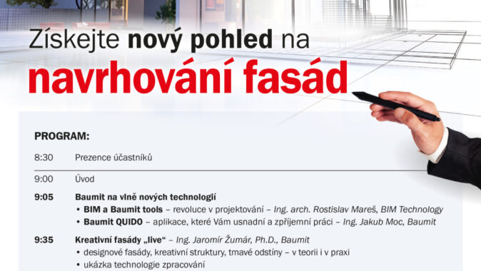 Tématem konferencí Baumit Akademie 2017 je: „Získejte nový pohled na navrhování fasád“. Představíme Vám BIM – technologii, moderní a efektivní proces tvorby stavebního projektu, jehož potenciál lze využít v celém životním cyklu budovy – od návrhu, přes výstavbu až po její využívání. Seznámíme Vás s aplikacemi, které Vám usnadní výběr fasádních systémů, kreativních povrchů a zrychlí proces rozhodování investora. Přineseme Vám ale také produktové novinky pro oblast fasád a nejnovější změny dle nové požární normy.