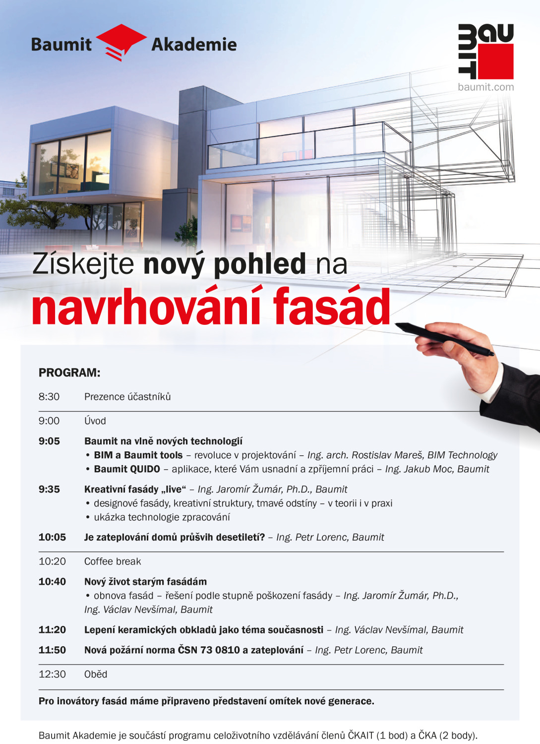 Tématem konferencí Baumit Akademie 2017 je: „Získejte nový pohled na navrhování fasád“. Představíme Vám BIM – technologii, moderní a efektivní proces tvorby stavebního projektu, jehož potenciál lze využít v celém životním cyklu budovy – od návrhu, přes výstavbu až po její využívání. Seznámíme Vás s aplikacemi, které Vám usnadní výběr fasádních systémů, kreativních povrchů a zrychlí proces rozhodování investora. Přineseme Vám ale také produktové novinky pro oblast fasád a nejnovější změny dle nové požární normy.